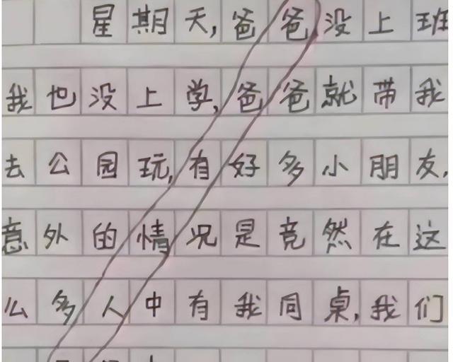 一位小学生写作文暗藏玄机,看作文内容,就是星期天爸爸带自己去公园玩,有很多小朋友,而在这么多人中竟然有小学生的同桌,两人愉快的玩了起来。