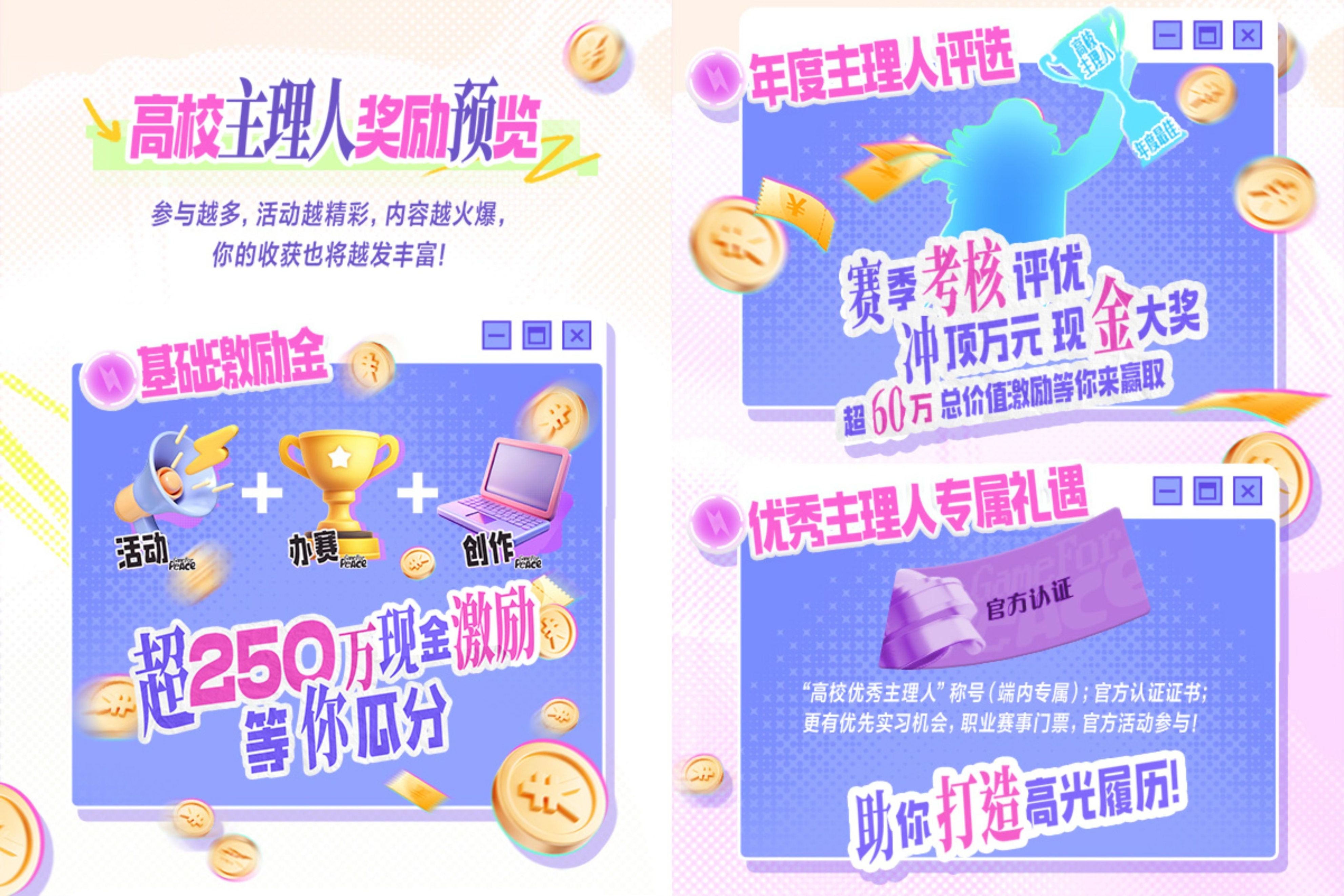 第一,高校办赛特权及激励。成为“主理人”后,将获得专属“一键办赛”特权,还可参与策划校级活动方案或组织图文视频创作,经官方评估即有机会获得丰厚的激励支持以及优质内容创作奖。并且只要参与以上内容,即可瓜分250万基础激励金、海量和平周边以及实物礼品。此外,每赛季考核评优的年度冠军“主理人”能够冲顶5万终极现金大奖!如获评“高校优秀主理人”,将获得官方认证证书,给予游学团建、明星活动以及世界赛门票等参与资格,更有机会获得大厂优先实习机会与就业推荐,在简历上留下浓墨重彩的一笔,为未来职业发展铺平道路。