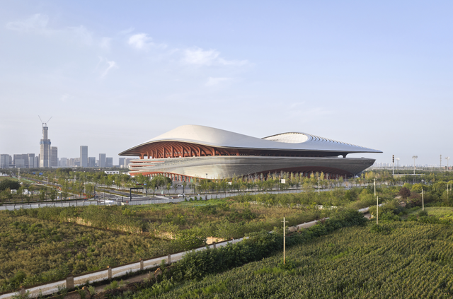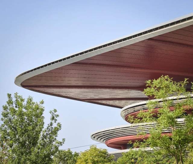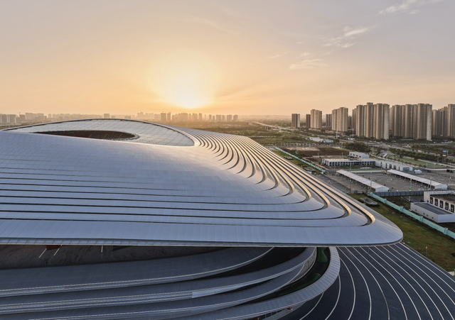 设计上,体育场以流畅形态回应西安冬季的北风影响,屋顶采用马鞍形流线结构,既保护看台区域,也提升了中场观众席的观赛质量。大跨度的索网屋顶不仅轻盈,还显著降低了建材使用与碳排放,体现出绿色建筑理念。