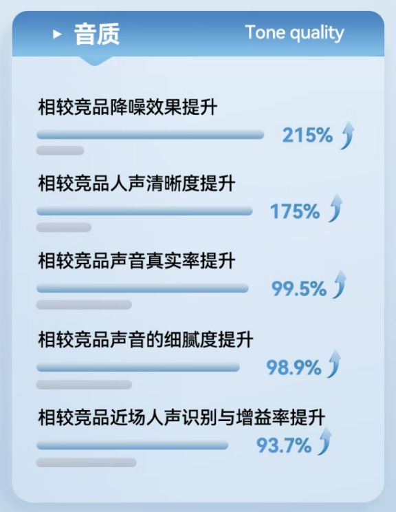 它的降噪性能也令人惊艳,几乎没有杂音、啸叫和电流声,声音听的很舒服,即使在嘈杂的环境中也能清晰听到对话。这主要得益于它采用了进口芯片,搭载自主研发的7重声音降噪、分离、柔化算法和核心SC-PIIE分段分区降噪技术后,可以针对39种场景,657种声音进行识别与计算,能自适应环境降噪,智能识别并处理各种噪音。与其他同价位产品相比,它在降噪方面表现尤为突出,实测数据显示,降噪效果提升215%。