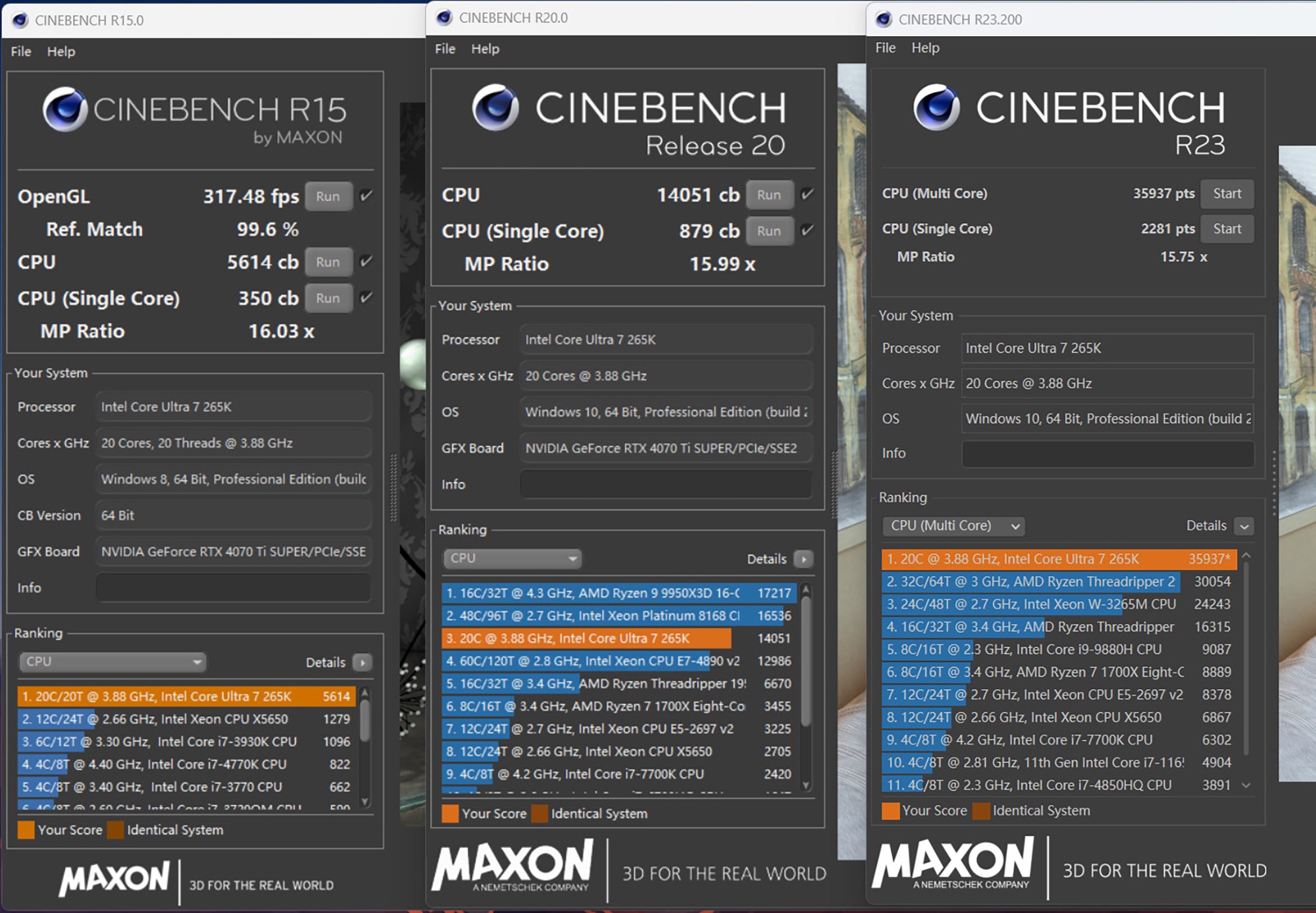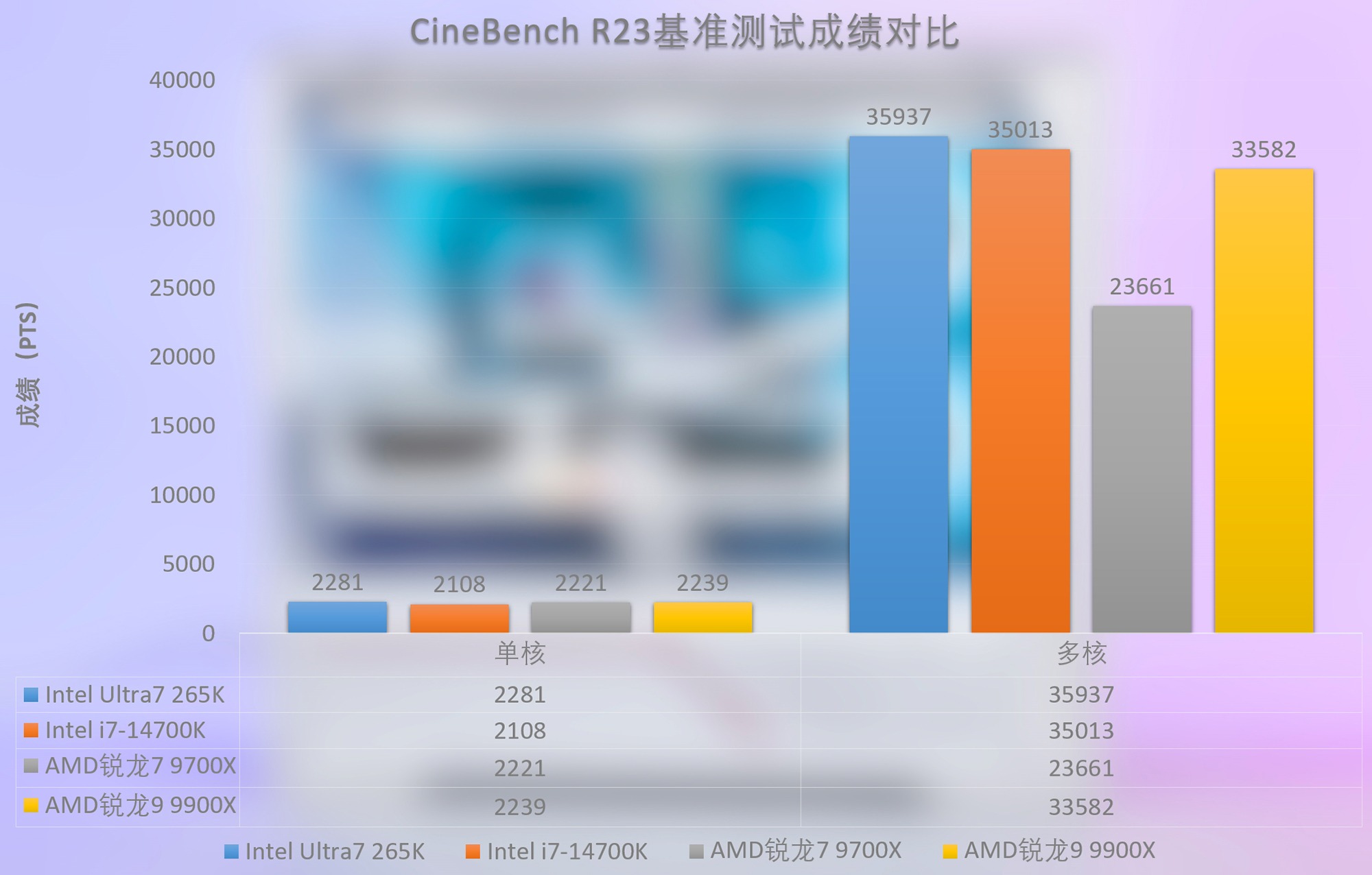 Intel Ultra7 265K处理器在CineBench R15基准测试软件中的多核成绩为5614分,单核成绩为350分,CineBench R20基准测试软件中的多核成绩为14051分,单核成绩为879分,而在CineBench R23基准测试软件中的多核成绩为35937分,单核成绩为2281分。