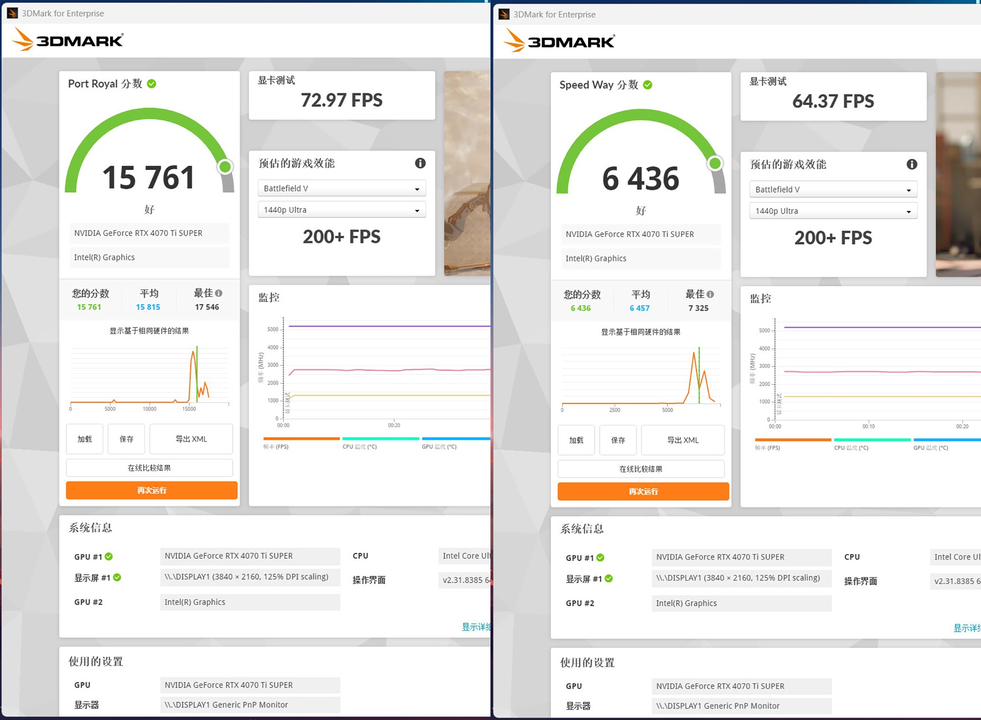 显卡的光线追踪性能测试,RTX4070Ti Super 16GB显卡在Port Royal项目的总得分为15761分,显卡测试帧率为72.97FPS,而在Speed Way项目的总得分为6436分,显卡测试帧率为64.37FPS。