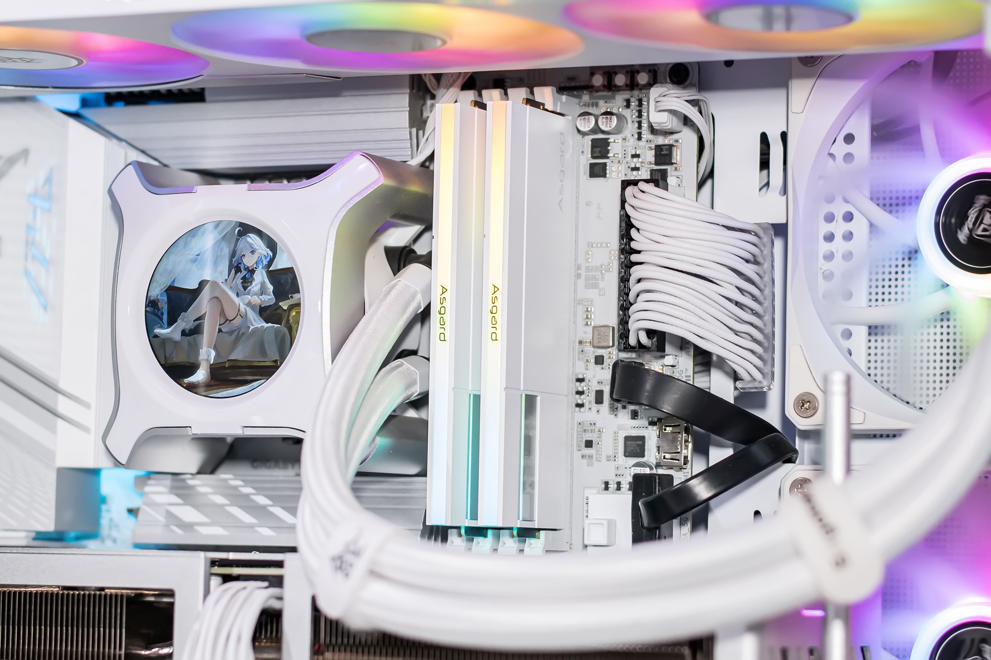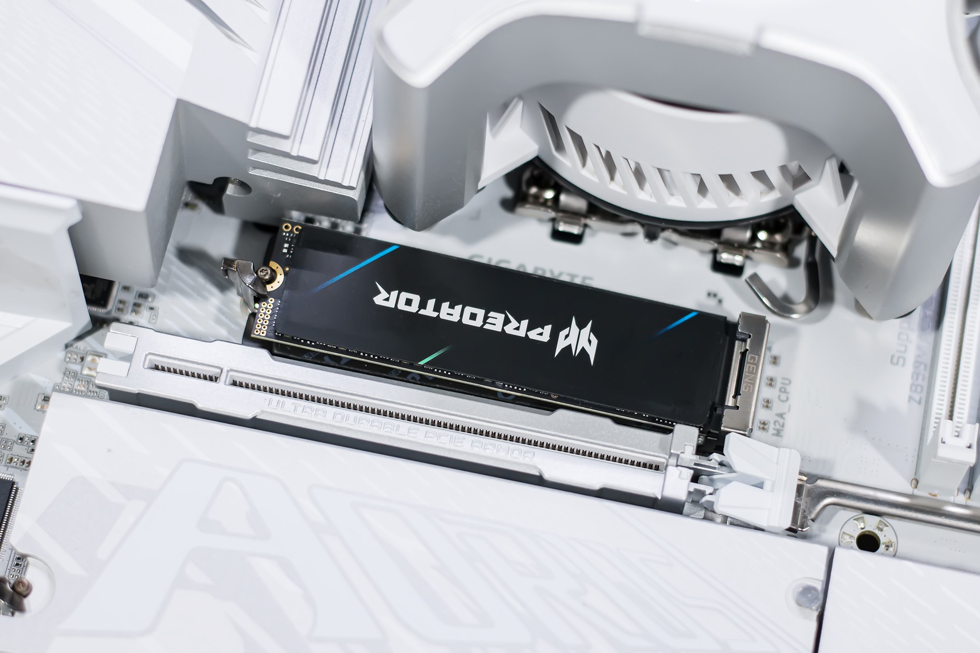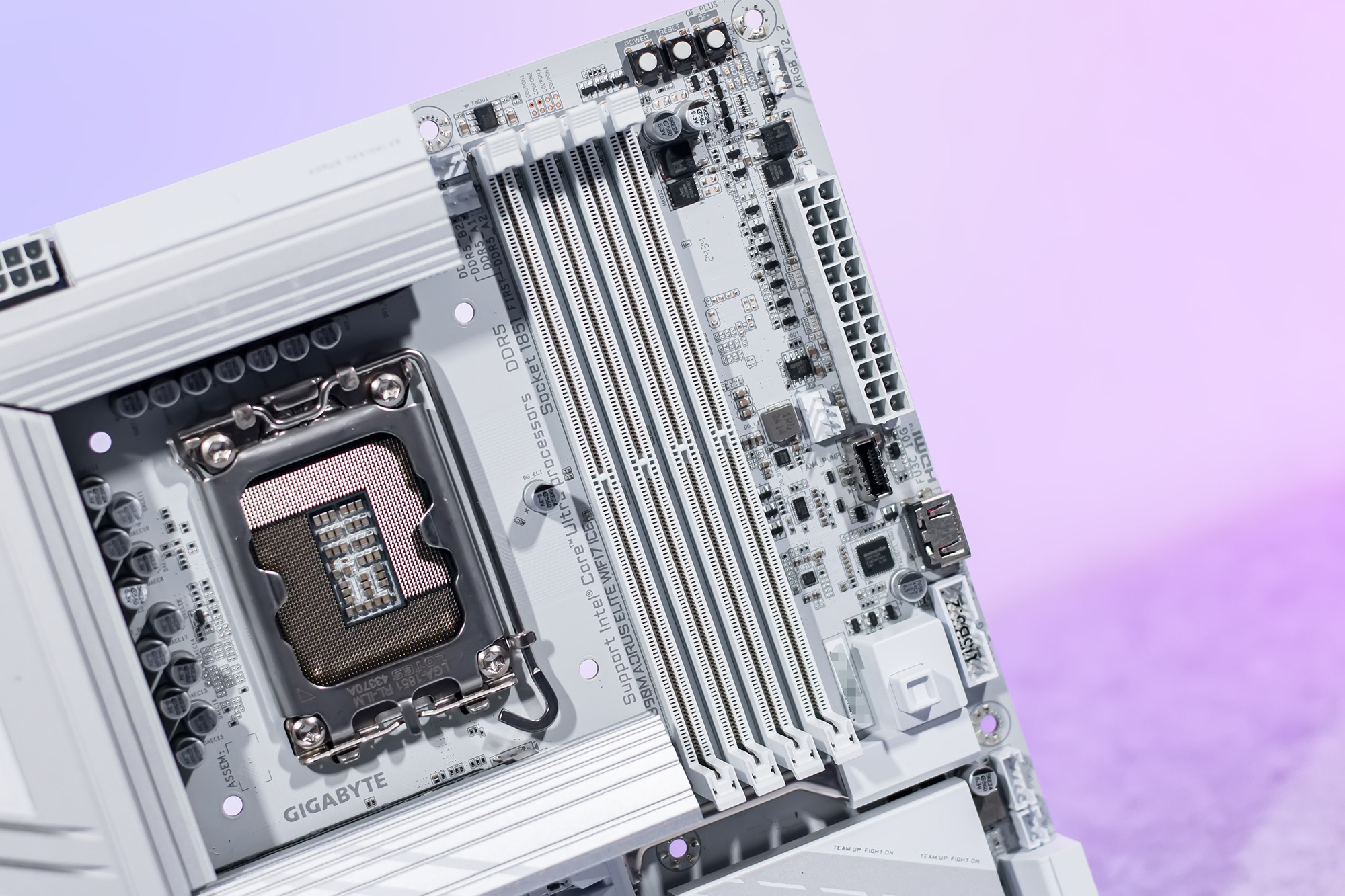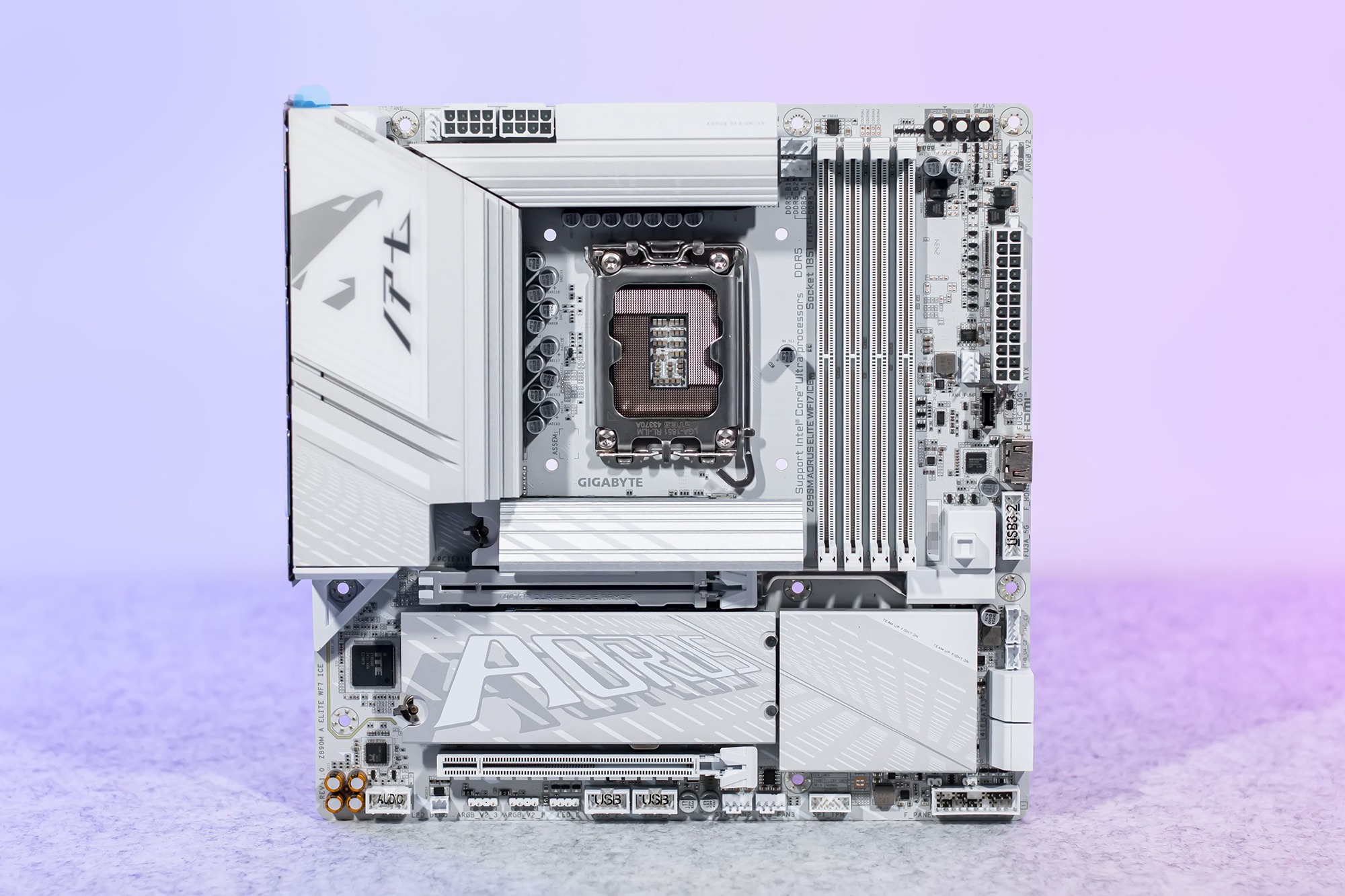 在主板选择方面,目前Z890与B860芯片组主板价格相近,个人更倾向于扩展性更高的Z890主板,可以充分发挥处理器在设备拓展方面的优势,包括M.2固态硬盘插槽数量与IO接口类型数量等,技嘉Z890M DDR5冰雕主板采用MATX尺寸规格,外观方面白得挺彻底,供电接口与内存插槽同为白色。