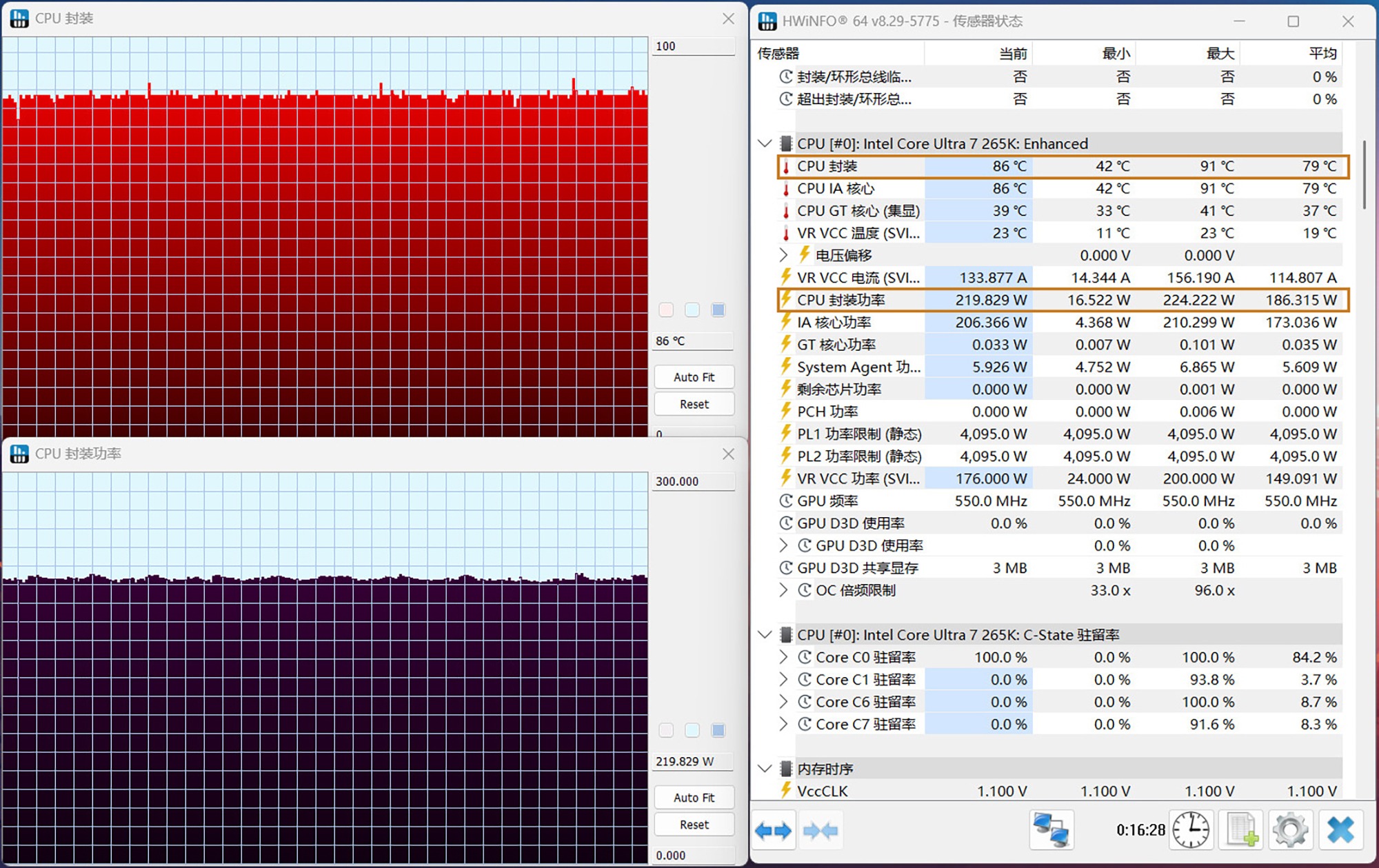 主板BIOS中性能模式选了Optimization,处理器核心电压策略较为激进,会导致满载时核心电压与功耗偏高,需要在主板BIOS中设定合理的电压值,或者切换至更为保守的性能模式,本次手动将处理器核心电压设为1.35V,完全不会影响性能发挥同时有效降低温度,在烤机状态下满载功耗为220W,温度维持在86℃。