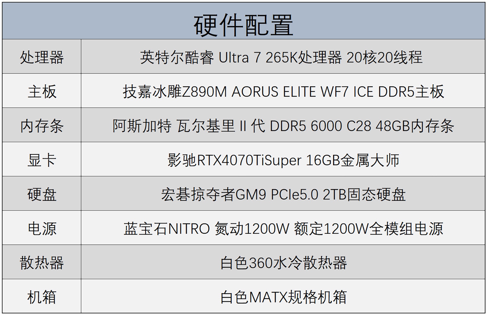 首先说一下详细硬件配置,处理器为Intel Ultra7 265K,主板为技嘉Z890M DDR5冰雕,显卡为影驰RTX4070Ti Super 16GB金属大师,内存条为阿斯加特女武神二代DDR5 6000 C28 48GB内存条,硬盘为宏碁掠夺者GM9 PCIe5.0 2TB固态硬盘,操作系统为Windows 11 24H2版本,电源为蓝宝石氮动1200W全模组电源,还搭配白色外观的MATX机箱与360水冷散热器。