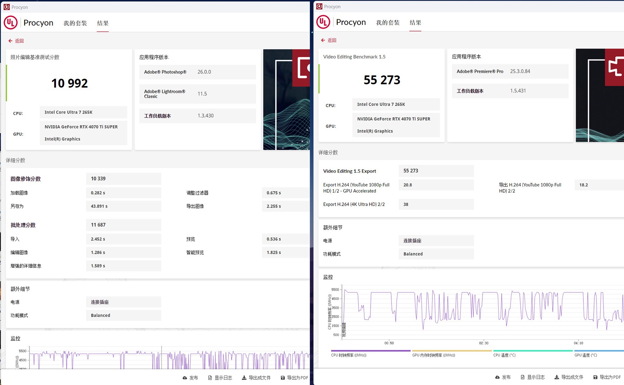 UL Procyon基准性能测试套件,可以测试硬件平台在视频图片处理以及AI生成方面的性能表现,实测照片编辑基准测试项目中的成绩为10992分,在视频编辑测试项目中(开启GPU加速)的成绩为55273分。
