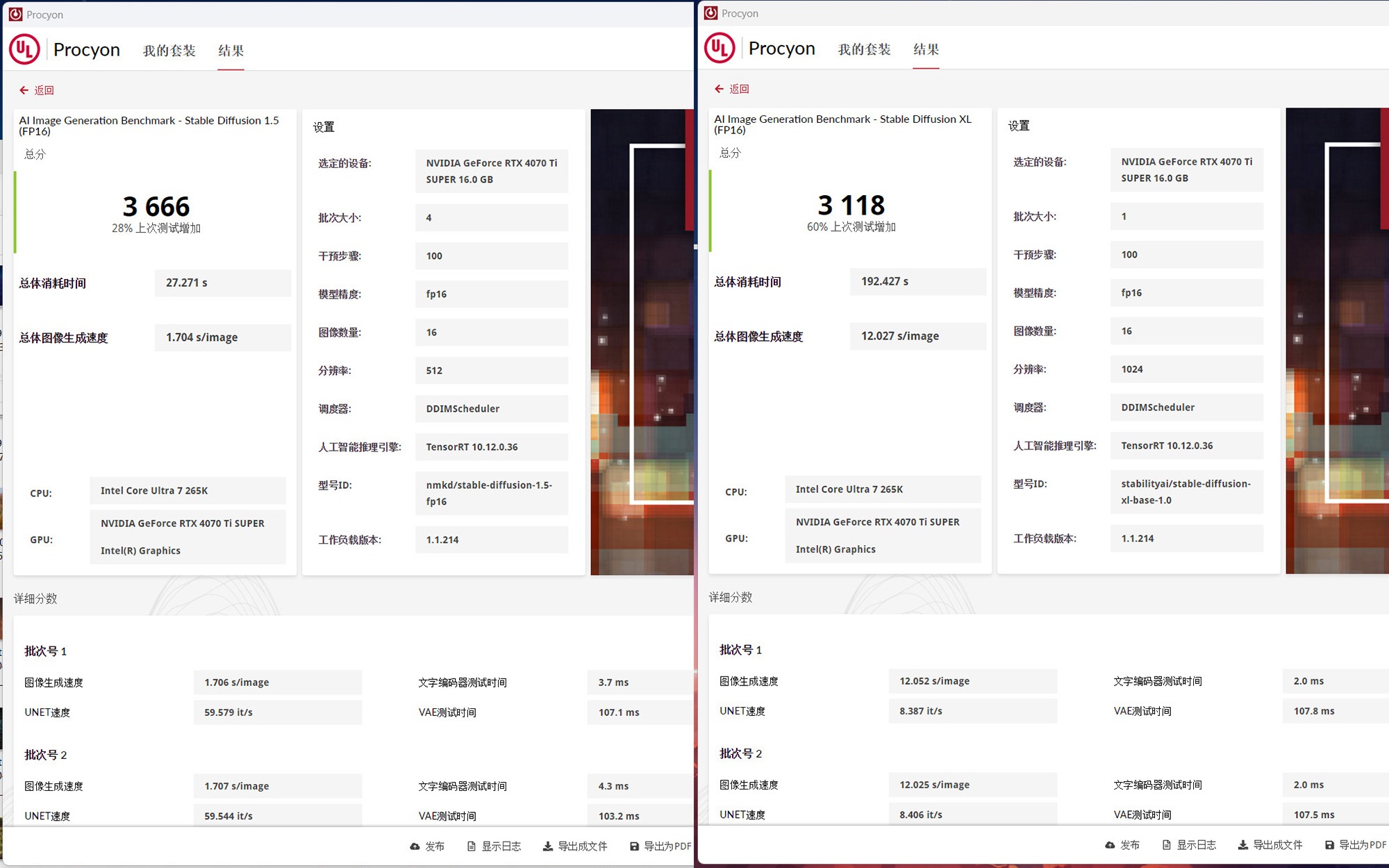 AI图像生成性能测试,其基于Stable Diffusion模型,本次选择的人工智能推理引擎版本为TensorRT,在Stable Diffusion 1.5(512×512)项目中的成绩为3666分,总体图像生成速度为1.704s/image,在Stable Diffusion XL(1024×1024)项目中的得分为3118,总体图像生成速度为12.027s/image。