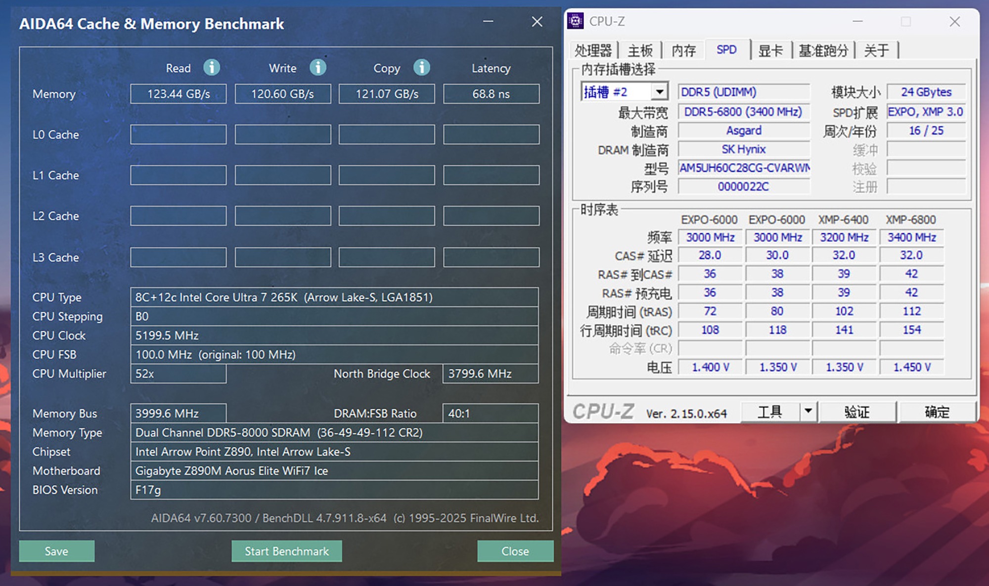 内存性能对Intel Ultra200平台有着较为明显的影响,本次将内存条超频至8000MT/s时序为CL36,优化了部分内存小参并能够通过压力测试,利用AIDA 64软件的内存基准测试功能,实测内存读取速度为123.44GB/s,写入速度为120.6GB/s,复制速度为121.07GB/s,延迟为68.8ns。