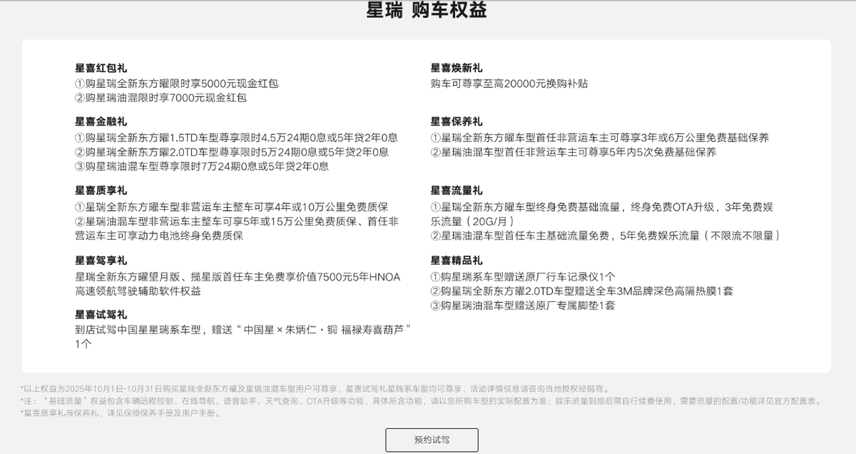 从文化设计到智能科技,再到强劲驾控,星瑞全新东方曜以9.37万起的亲民价格,为燃油轿车市场树立新标杆。目前购车还可享5000元现金红包、至高20000元换购补贴,以及3年或6万公里免费基础保养,无论是日常通勤还是长途出行,都能让用户尽享高品质出行体验。