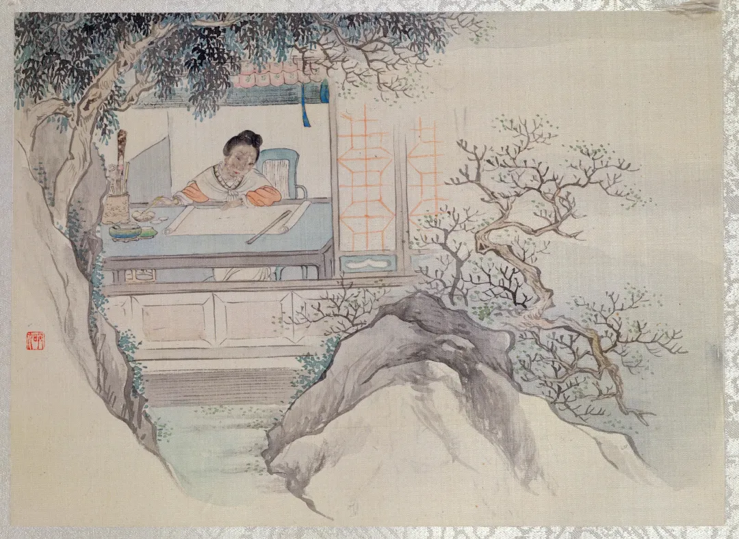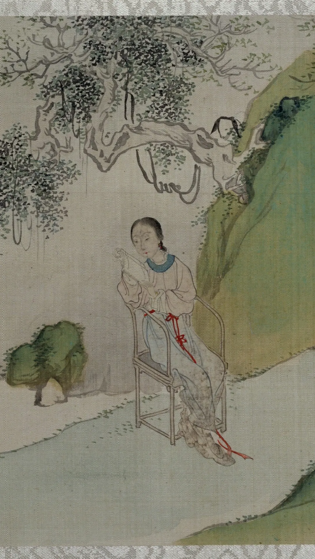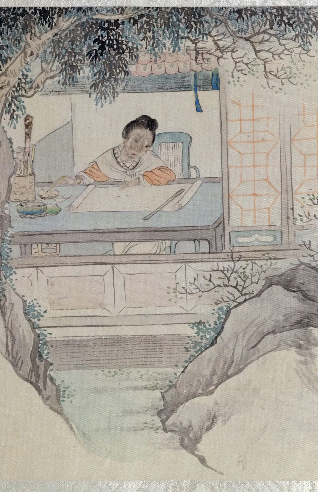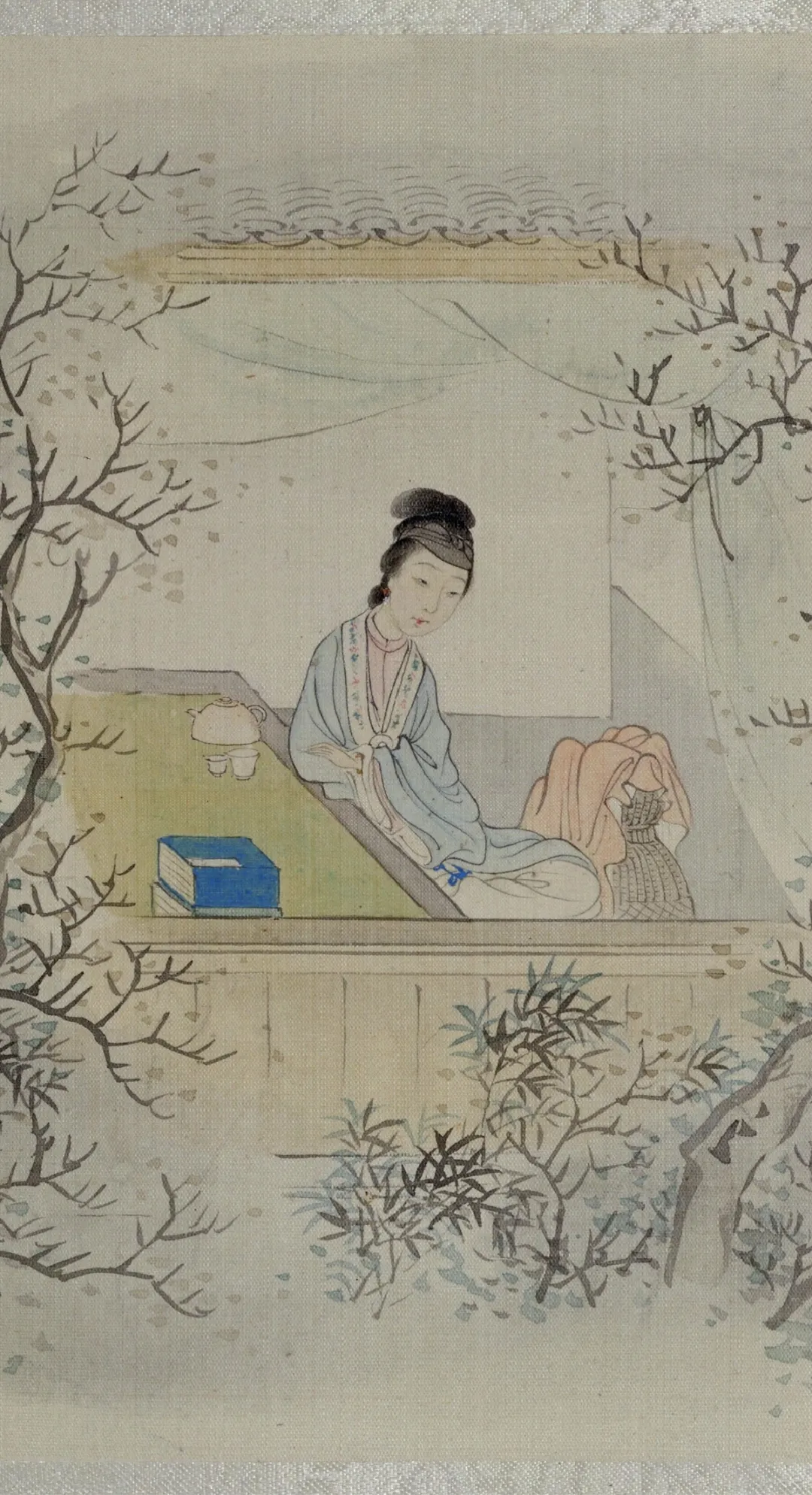 探春读贴绢本 设色 每开 20.3x27.7cm才自精明志自高,生于末世运偏消。清明涕送江边望,千里东风一梦遥。探春喜欢书法,搬张椅子在小院里松下读贴,好随性惬意。