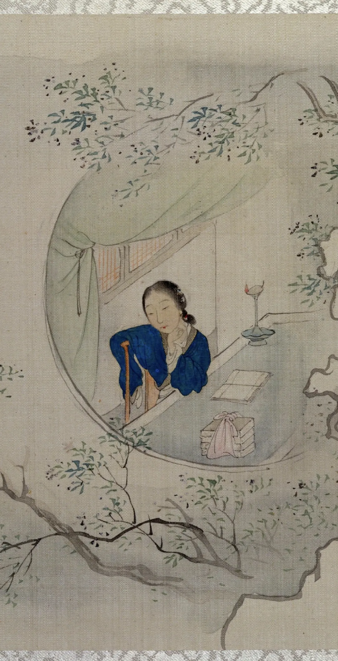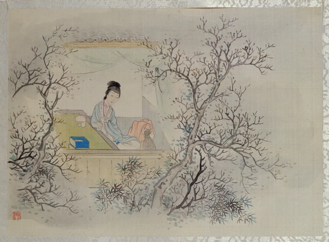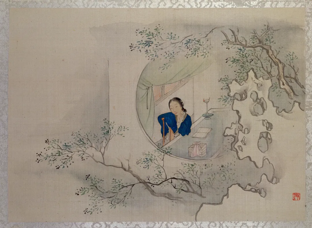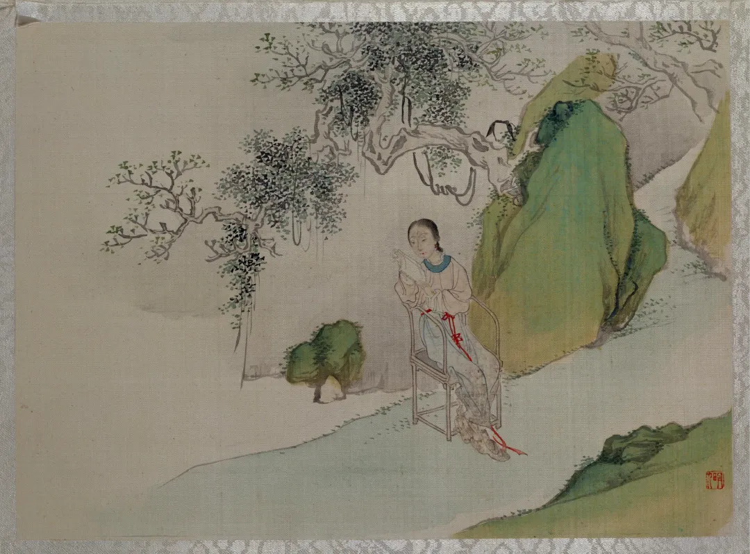探春读贴绢本 设色 每开 20.3x27.7cm才自精明志自高,生于末世运偏消。清明涕送江边望,千里东风一梦遥。探春喜欢书法,搬张椅子在小院里松下读贴,好随性惬意。