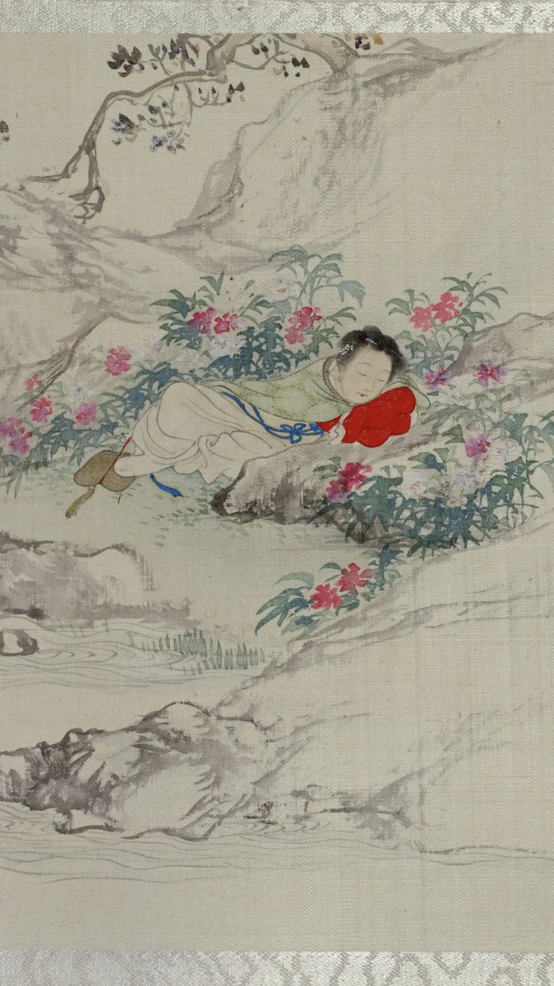 “湘云卧海棠”出自《红楼梦》第六十二回,“憨湘云醉眠芍药裀 呆香菱情解石榴裙”。这一回中,史湘云在贾宝玉的生日宴上,喝得不少啦,就在那芍药花丛中的石凳上沉沉地酣睡起来,花瓣纷纷扬扬地落了她满身,那模样憨态可掬着呢,成为《红楼梦》中极富画面感的经典场景之一哟。