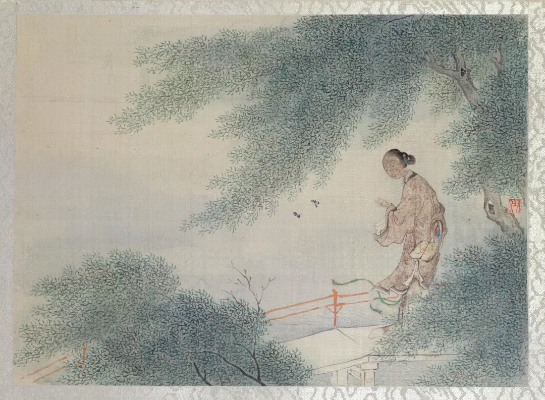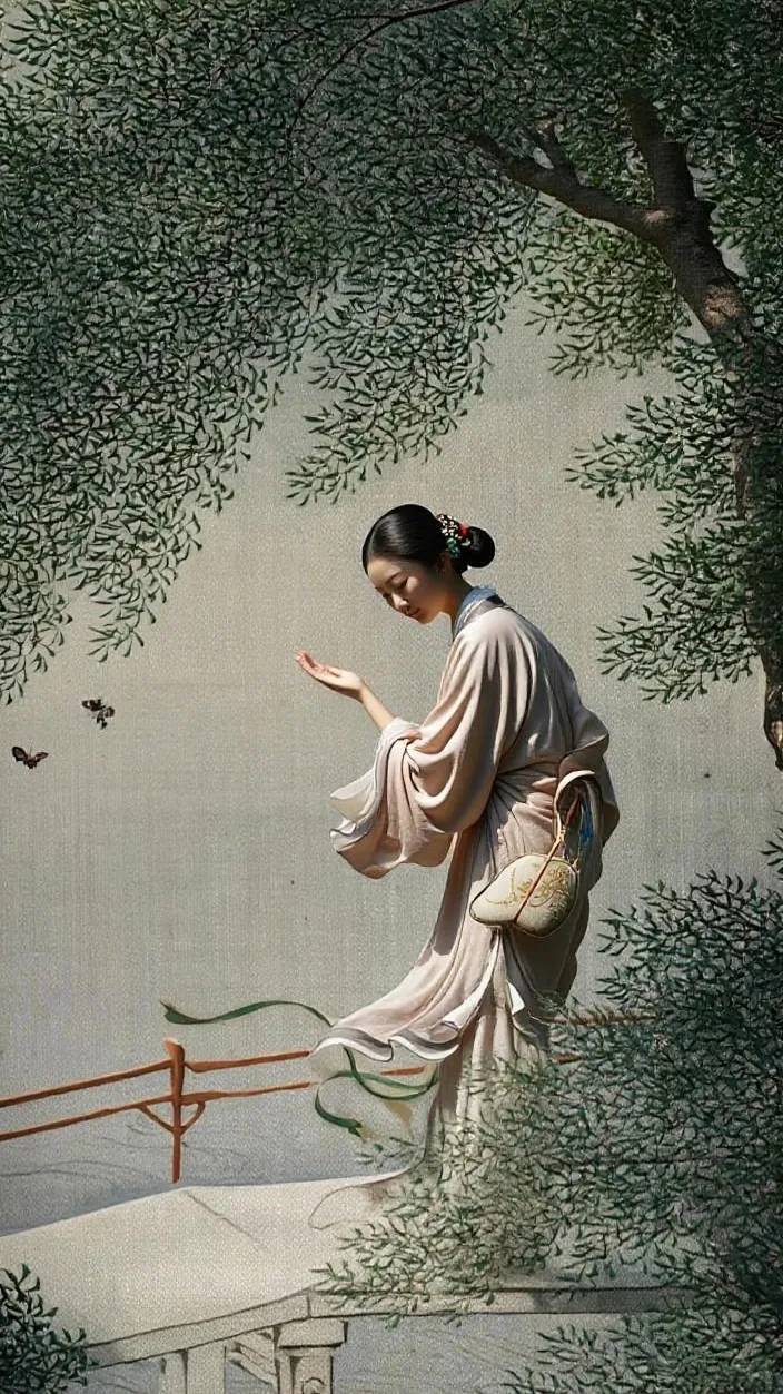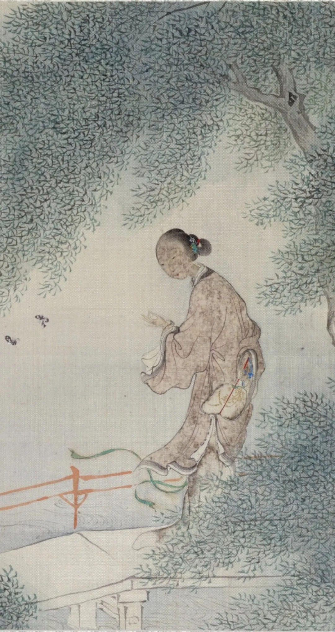 夏日的风,轻拂着柳枝,宝钗衣衫随风飘动,暂时忘却了,那些束缚和规矩,露出难得的少女天真。藕荷色雅淡的衣服很合她的性格。也有说两只蝴蝶象征的是林黛玉和贾宝玉这对情侣。