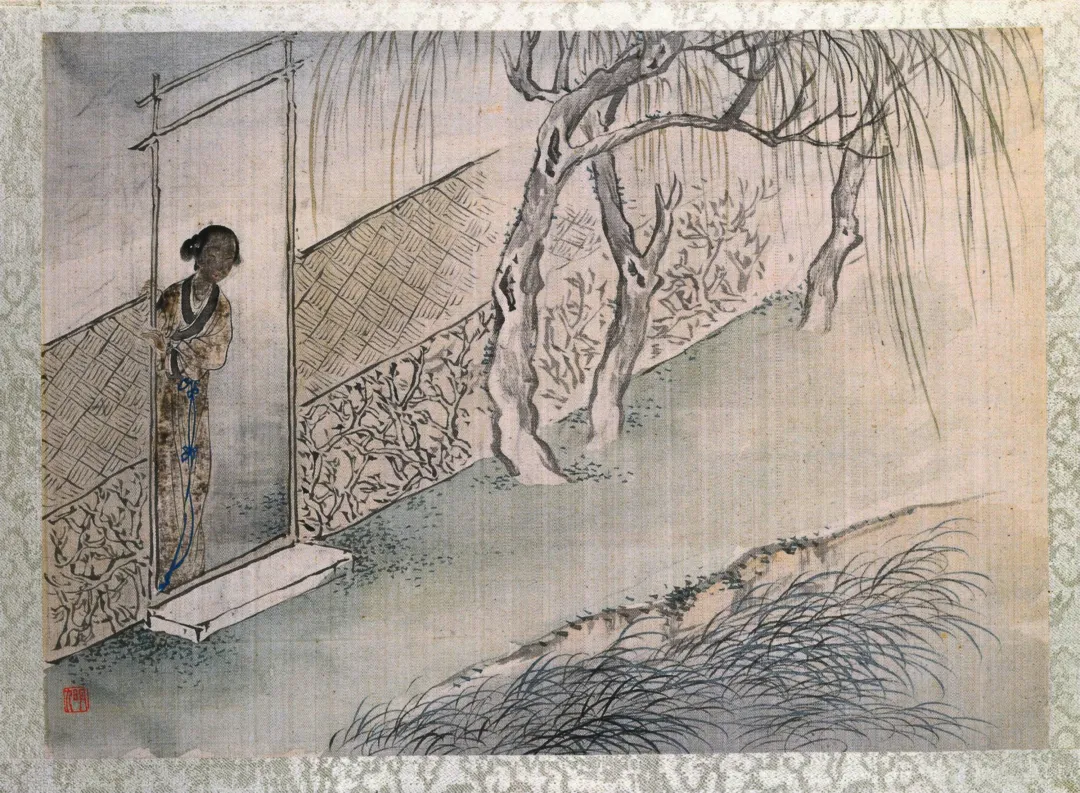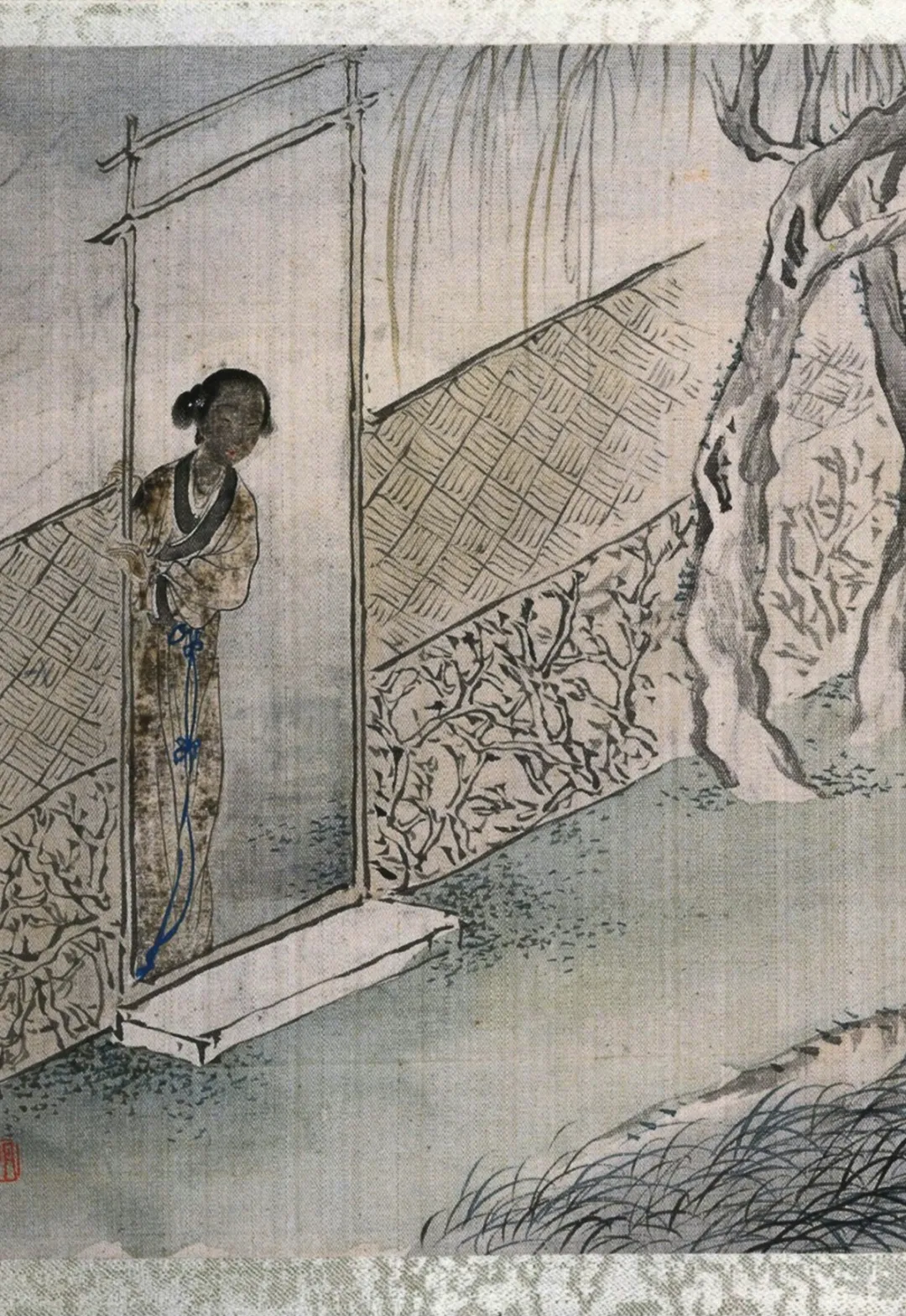 一位少女站在柴门边,望着被疾风翻滚的枯草,若有所思,若有所盼,垂下的柳条也是光秃秃的。