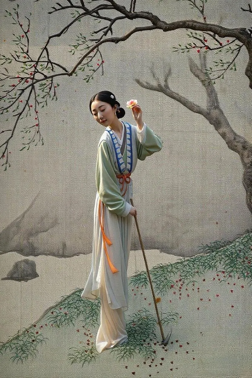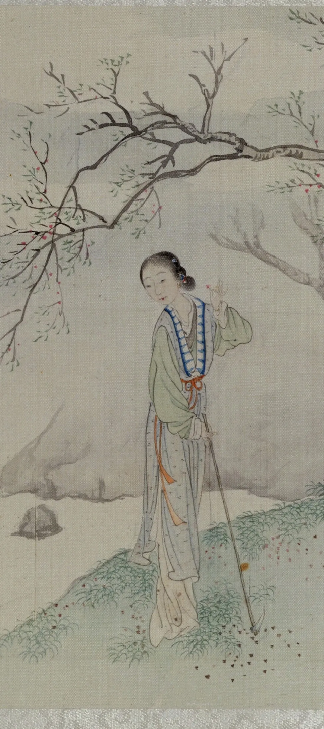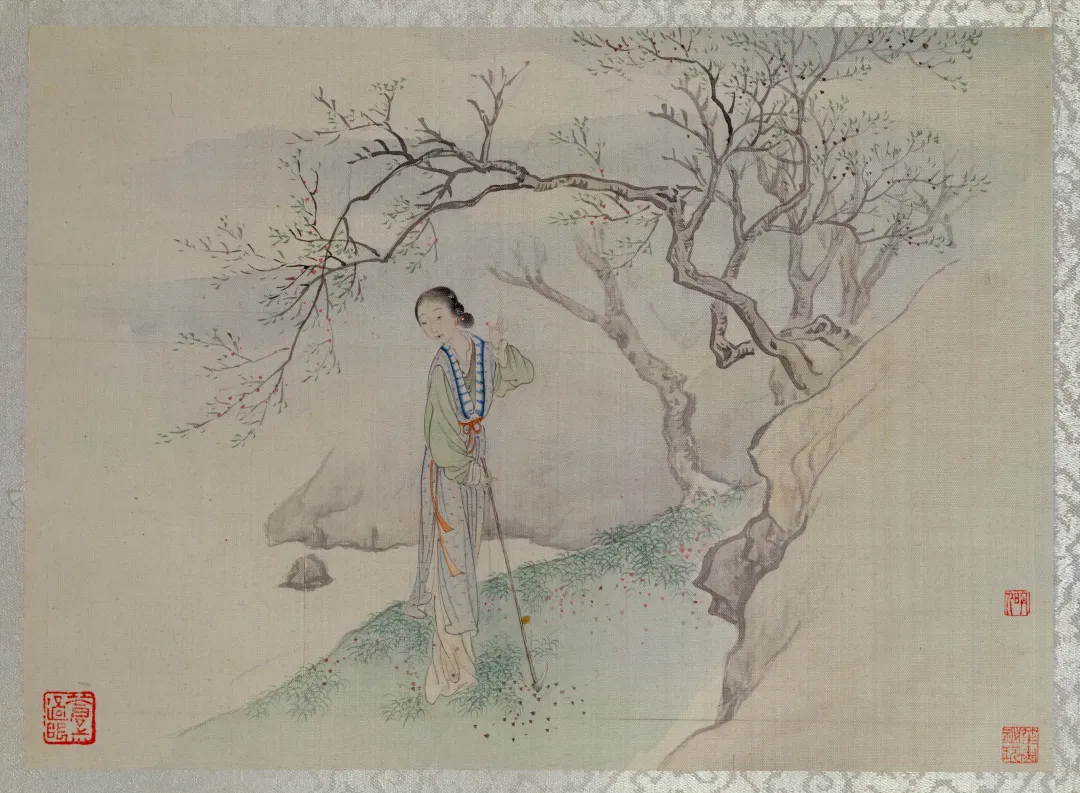 黛玉的身形格外纤柔,淡绿色的衣衫像雨后的笋尖。裙子上的小碎花与落英相映成趣。整幅画用了清新的绿调子,唯有枝头零星小花,地上落英,黛玉的系带是红色的,正合暮春时节“绿肥红瘦。”
