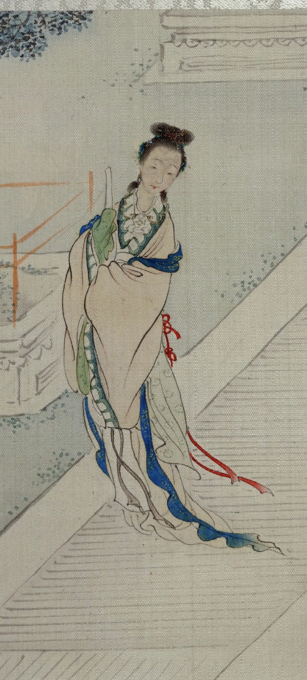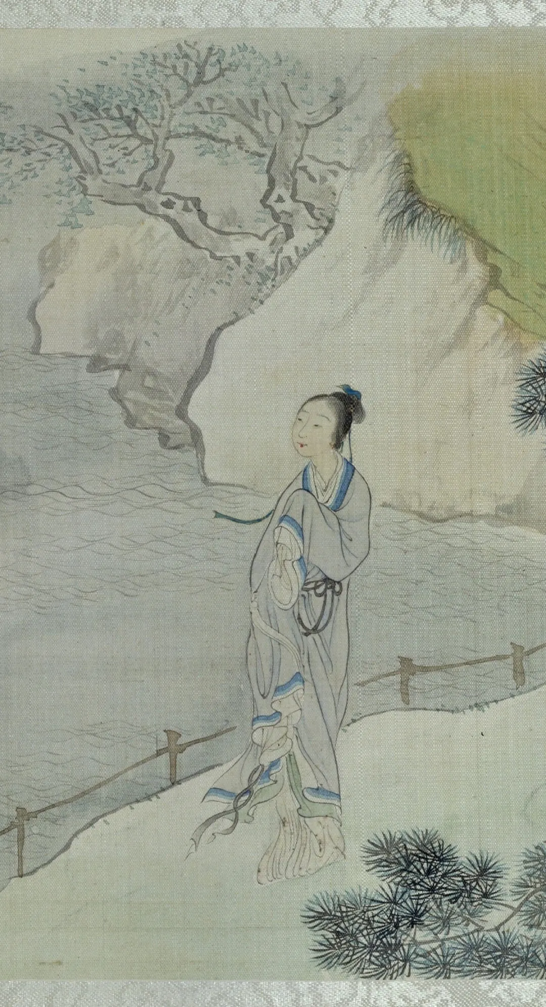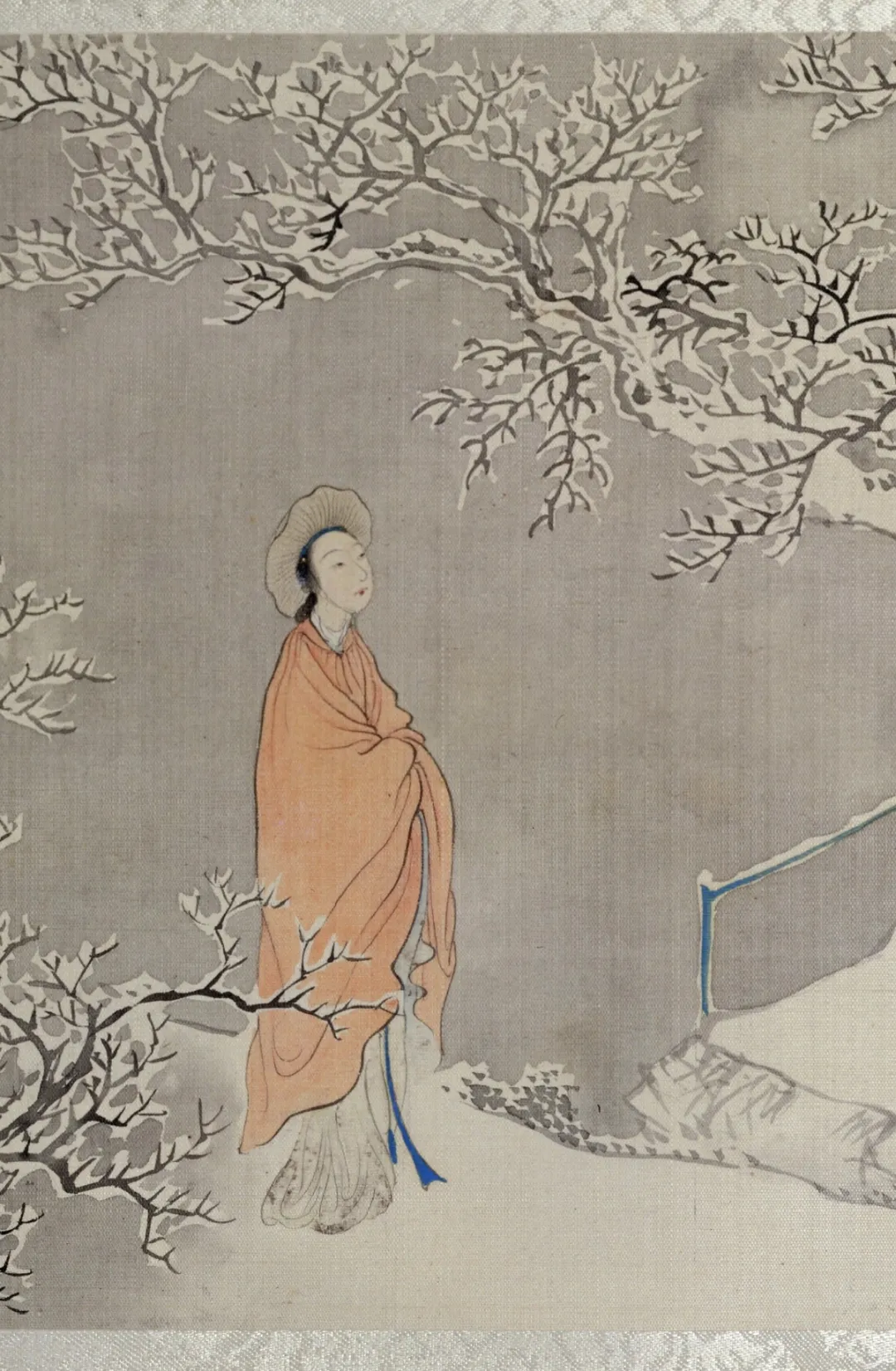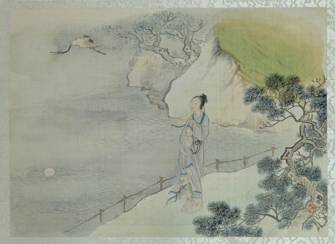 妙玉是个有才华的少女,听到湘云和黛玉联诗便有知己之感,邀她们去栊翠庵喝茶。可是碍于出家人身份,与贵族少女们不能常来常往。这一副画中只有妙玉一人,站在湘云和黛玉吟诗联句的地方,看寒塘渡鹤影,看水中一轮明月。