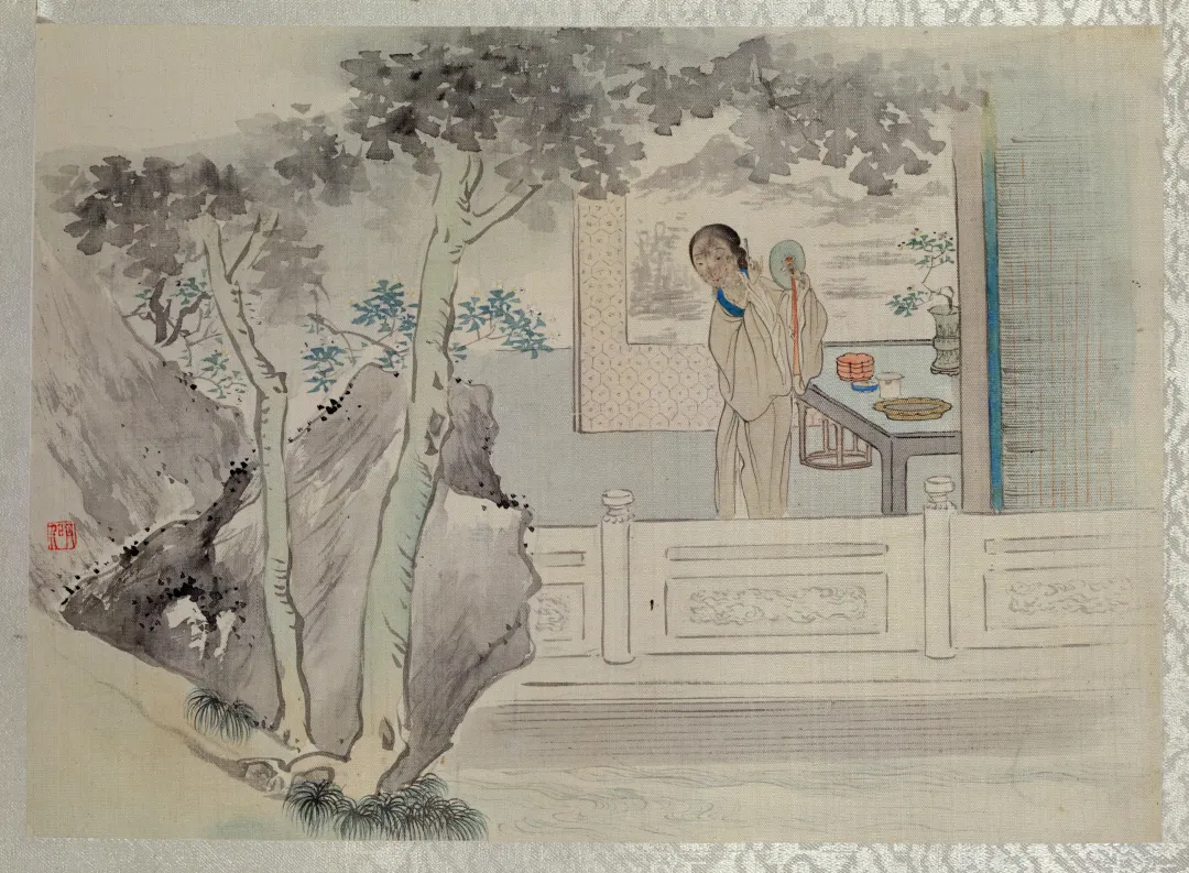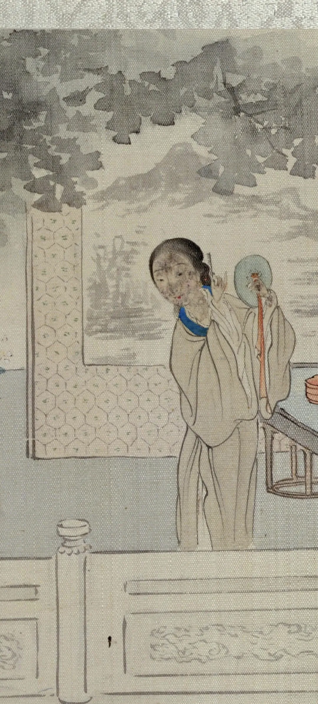 望着镜中的眼神特别妙。可卿是考究人,打扮起来一丝不苟。整幅画的构图充满幽静之美。可惜脸上的白粉有些返铅。