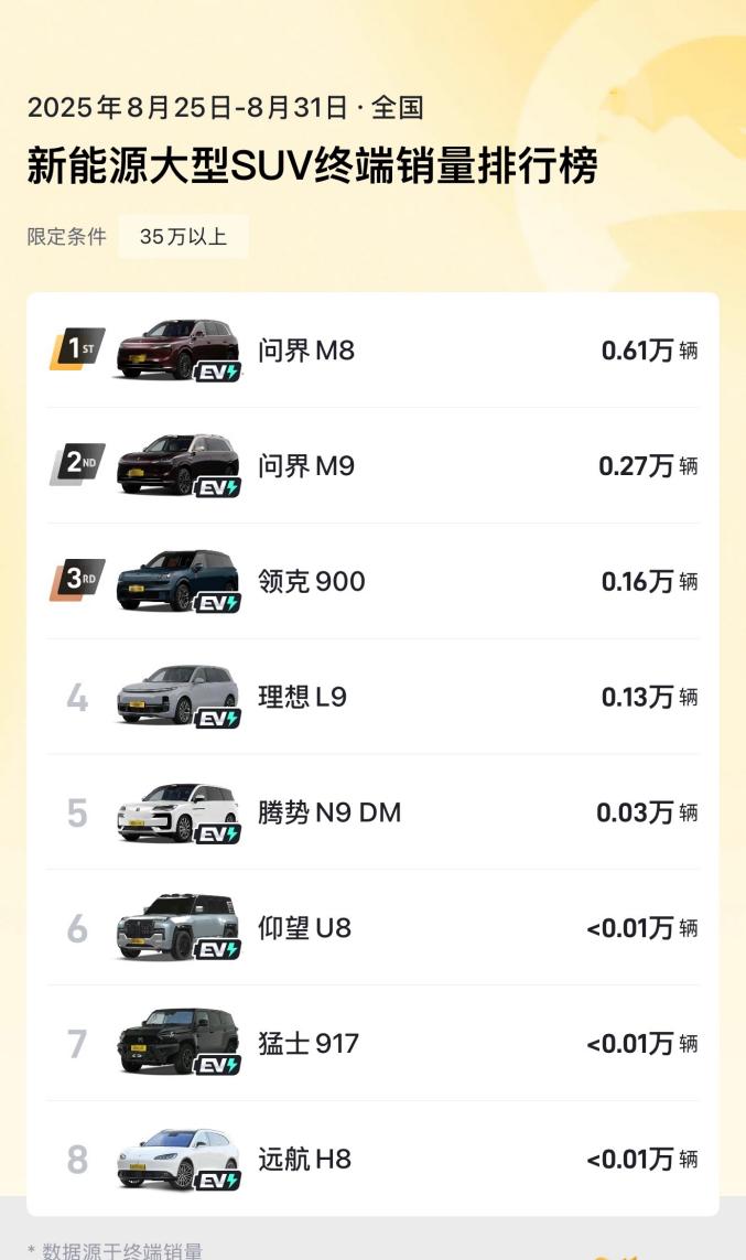 2025 年,家庭用户购车需求持续升级,大型 SUV 市场竞争愈发激烈,众多车企纷纷推出新车型抢占赛道。在此背景下,领克 900 自上市以来表现亮眼,凭借出众产品力在大型高端混动 SUV 市场保持热销态势。据 2025 年 8 月 25 日 - 8 月 31 日全国新能源大型 SUV 终端销量排行榜数据显示,领克 900 以 0.16 万辆的销量位列第三。