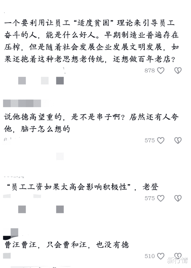 有的网友却表示,“说他德高望重的,是不是串子啊?居然还有人夸他,脑子怎么想的”“一个要利用让员工‘适度贫困’理论来引导员工奋斗的人,能是什么好人。早期制造业普遍存在压榨,但是随着社会发展企业发展文明发展,如果还抱着这种老思想老传统,还想做百年老店?”“曹汪曹汪,只会曹和汪,也没有德”……