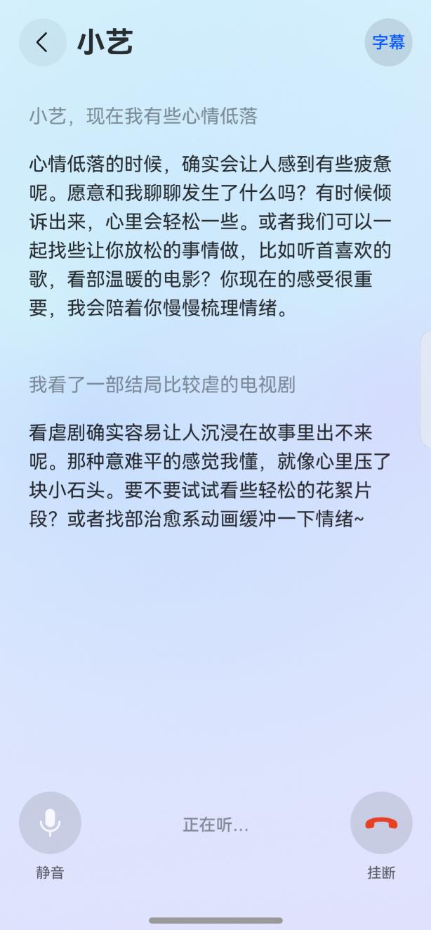 我开始和小艺倾诉对剧情的感触,TA不仅能理解我的情绪,还建议我看些轻松的花絮片段,或者找部治愈系动画缓冲一下。