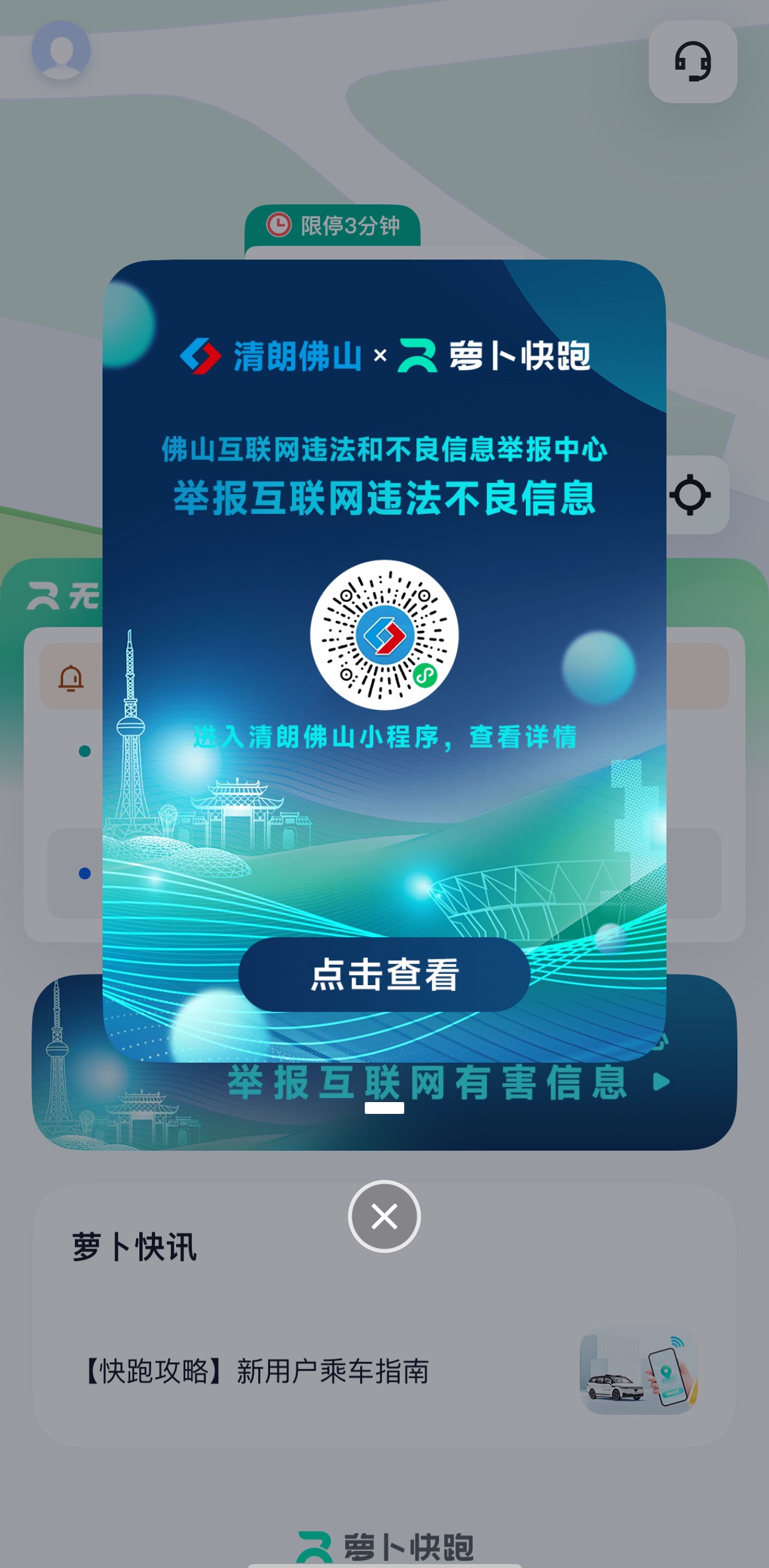 同时,用户登录萝卜快跑App时,系统会自动弹出网信普法弹窗,点击弹窗即可跳转至“清朗佛山”小程序,便捷获取个人信息保护等实用法律知识与安全指引。