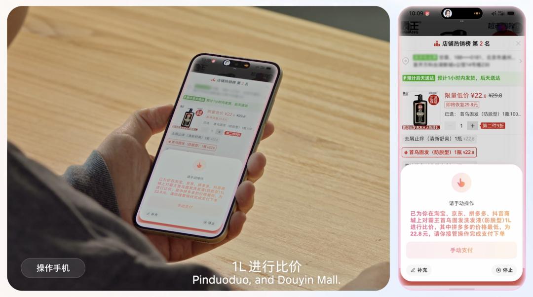 ● 豆包手机助手正为用户跨平台比价购物。图源:豆包手机助手官网演示视频截屏