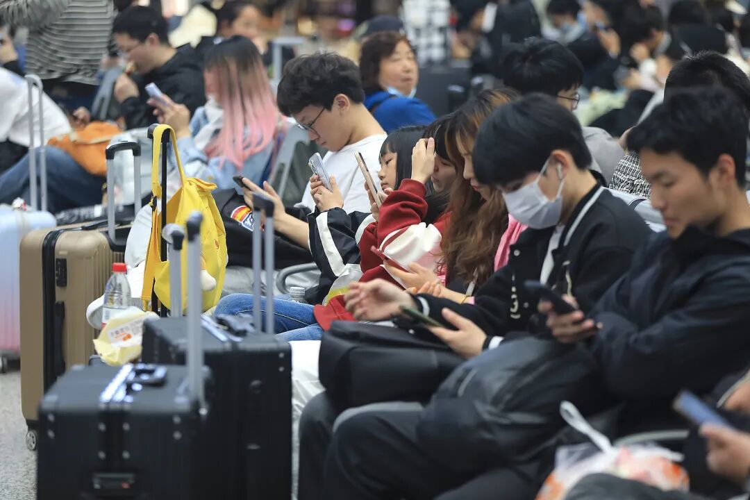 ● 2024年5月1日,上海虹桥高铁站,迎来旅游、探亲大客流,等待的旅客在刷手机。图源:视觉中国