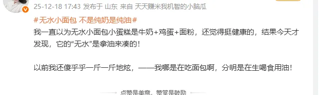 小柴去翻阅了一下一些网红顶流商超所售的无水蛋糕,基本上都是以纯油配方为主。消费者误认“无水=纯奶”,实际成品可能含油量超30%。对此,有网友表示,难怪入口有明显油润感,被调侃为“油浸馒头”。也有网友指出,纯油配方面包热量达200-400大卡/100克,远超普通馒头(约220大卡)有网友表示:我一直以为无水小面包小蛋糕是牛奶+鸡蛋+面粉,还觉得挺健康的,结果今天才发现,它的“无水”是拿油来凑的!以前我还傻乎乎一斤一斤地炫,——我哪是在吃面包啊,分明是在生喝食用油!