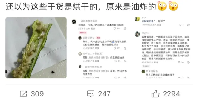 再比如还有前不久小柴报道过的果蔬冻干塌房事件,和这次的无水面包如出一辙,竟然是油炸?果蔬冻干塌房上热搜!减肥人集体破防……无数追求健康的人士,每天高价购买所谓的冻干果蔬,但所谓的冻干,竟然是纯油炸。