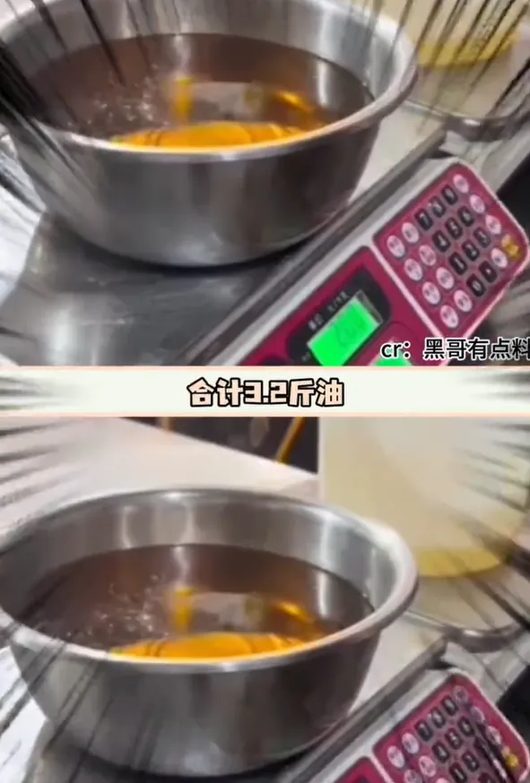 说好的没有一滴水,竟然是3.2斤油,这你受得了吗?但这还没完,随后他用这些油去浸泡肉松,然后让肉松去充分吸收这些油,再准备面粉和鸡蛋,然后,倒进去了3.5斤的白糖。