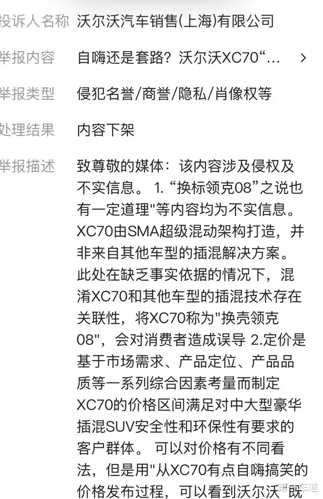 作为一款重量级车型,沃尔沃汽车XC70自上市以来获得了广泛关注。第一车道新媒体矩阵日前发文《新车|自嗨还是套路?沃尔沃XC70“限时参考尊享价”不如来个“一口价”》对XC70进行了报道,令人意外的是,这篇文章竟然被沃尔沃以“侵犯名誉/商誉权”为由投诉下架。