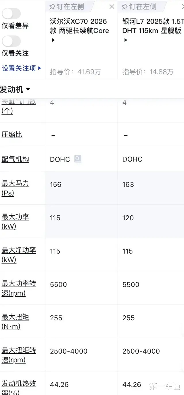 在查阅相关数据过程中,第一车道发现XC70搭载的插混发动机与吉利旗下多款车型的发动机一样,包括领克08EM-P、吉利银河L7以及银河星耀8等车型。我们不妨以吉利银河L7为例与沃尔沃XC70对比一下:二者型号都是BHE15-BFZ,都是1.5T,最大净功率都是115KW,最大扭矩都是255牛米,发动机热效率都是44.26%,排放标准也都是国六B。不过二者也有些许区别:吉利银河L7的最大功率是120KW,而沃尔沃XC70的最大功率是115KW;吉利银河L7加92号汽油,而沃尔沃XC70加95号汽油。