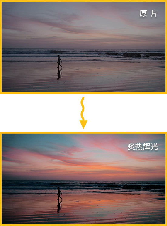 选“炙热辉光”:画面瞬间变得温暖又有张力,感觉小孩是在沙滩上挑战自己、战胜困难,故事感和紧张感一下就上来了。