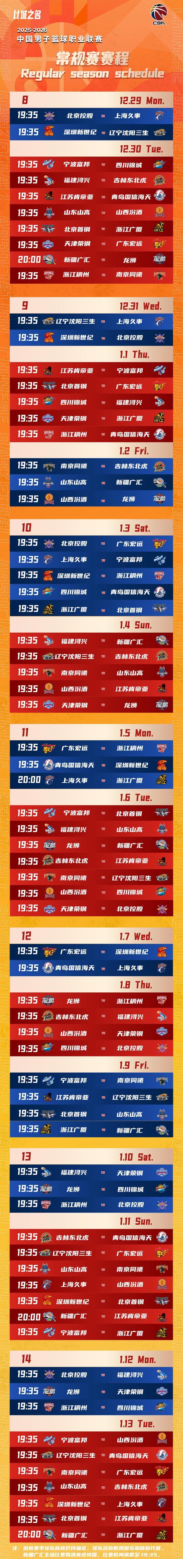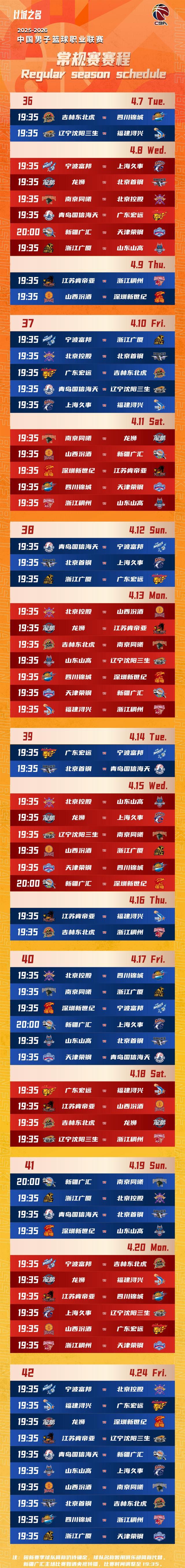 北京时间10月20日,CBA官方公布2025-2026赛季CBA联赛常规赛将于12月12日开赛,次年4月24日收官,具体赛程公布如下。
