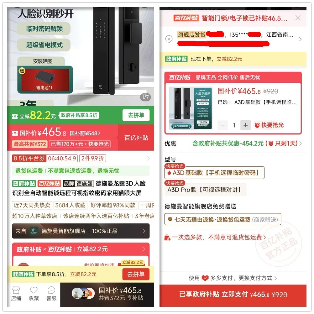 我用自己号测了一下,如果走PDD万人团的话,这个指纹锁价格还能低10元,我这显示是469元。但如果走另一个链接用政府补贴的话,最低能做到465.8元,而A3D基础款就是A3FD,最大缺点是阉割了内门的屏幕。