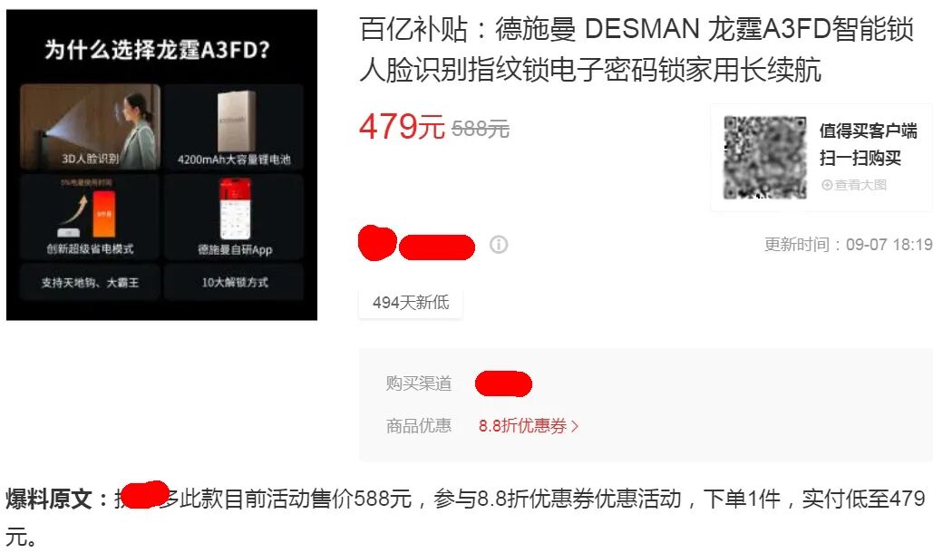 根据张大妈爆料,德施曼龙霆A3FD指纹锁在PDD最低能做到479元。原价乱七八糟的,我在狗东搜同款型号从两千多到三千多都有,在某猫搜是原价1699,叠加百亿补贴后最低599,而PDD那边是目前最便宜的。