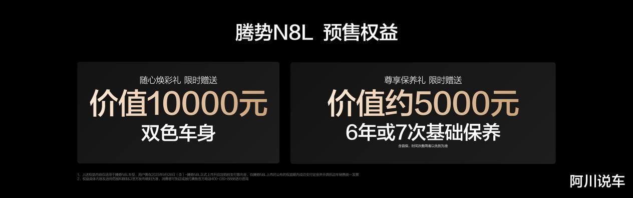 9月26日,腾势汽车全新大六座安全豪华SUV——腾势N8L正式开启预售,预售价31.98万至34.98万元。作为与科技安全旗舰SUV腾势N9一脉相承的家庭豪华伙伴,腾势N8L与腾势N9共同构成了腾势品牌独有的旗舰豪华双子星矩阵,分别瞄准不同细分市场。腾势N9定位科技安全旗舰SUV,科技力拉满、豪华感给足,更追求旗舰的科技性能。腾势N8L则是更聚焦家庭的安全豪华SUV,继承了N9的安全技术和灵活驾控,有大空间和豪华感,更追求家庭的豪华舒享。