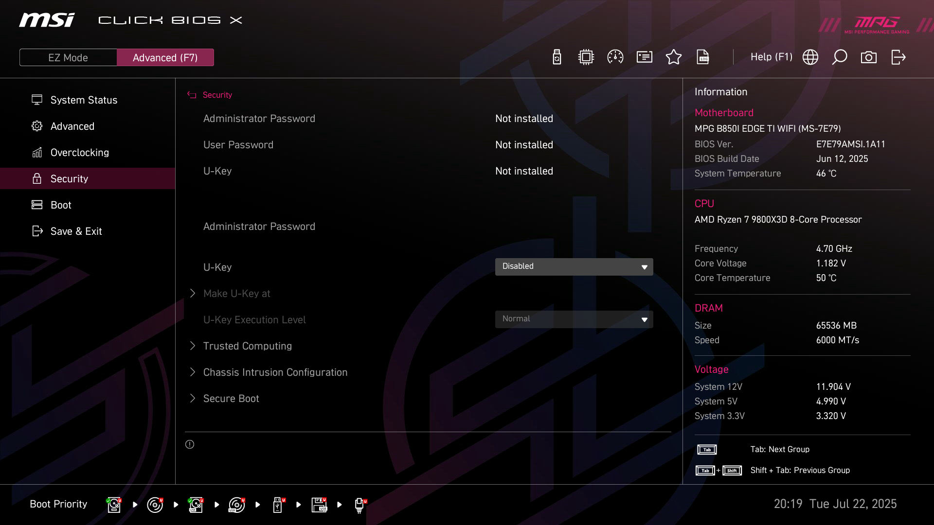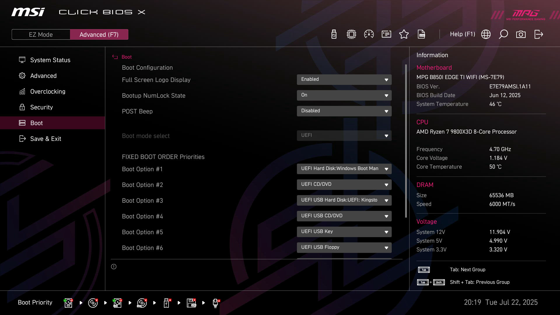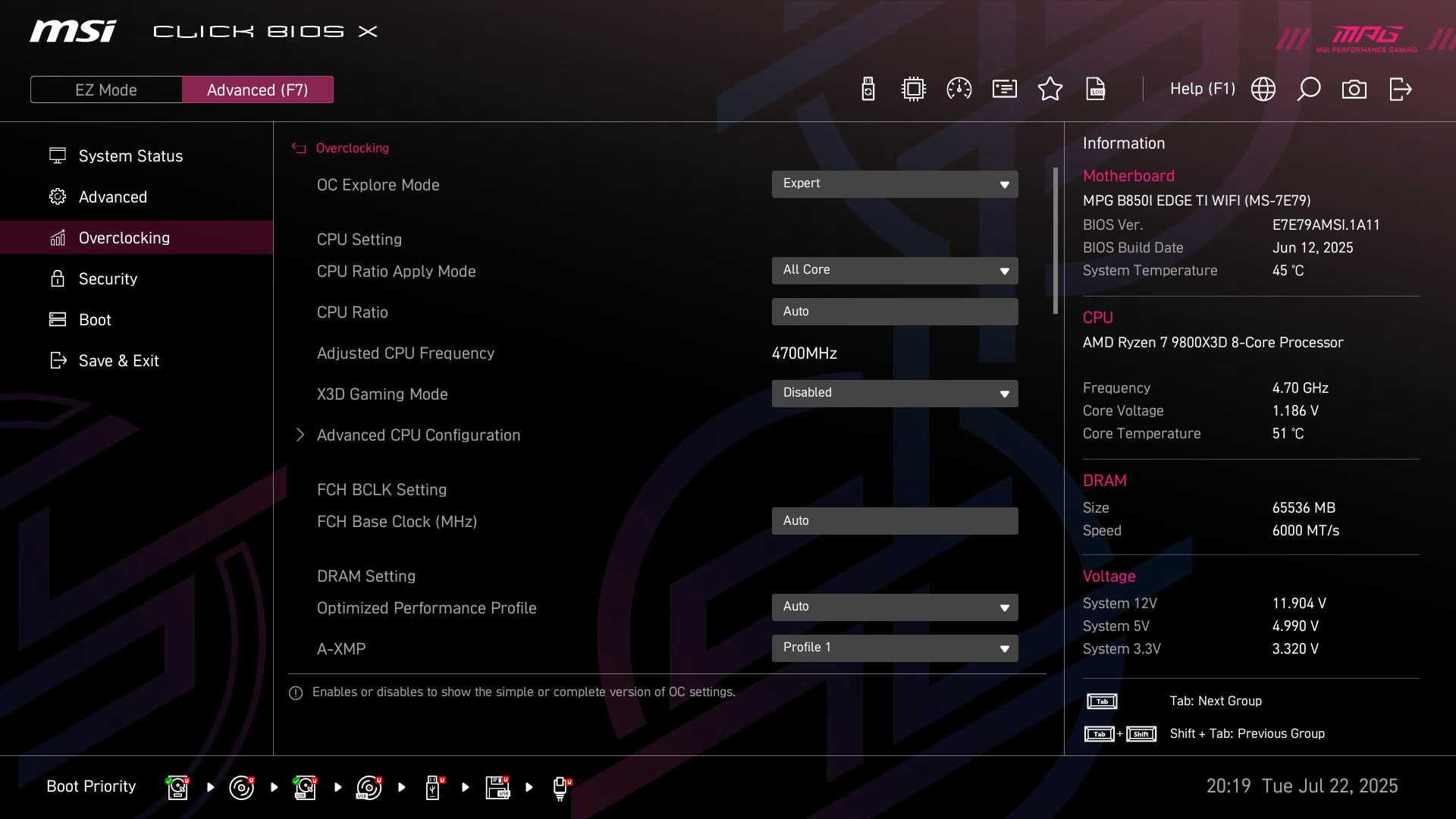 主板的EZ模式整合度非常高,将大多数常用功能都整合了进来,如Game Boost模式的开启、内存XMP/EXPO的开启、PBO模式、Memory Try It!功能、LED灯效控制、风扇曲线调节等,基本上不用进入进阶模式就能实现大多数操作。