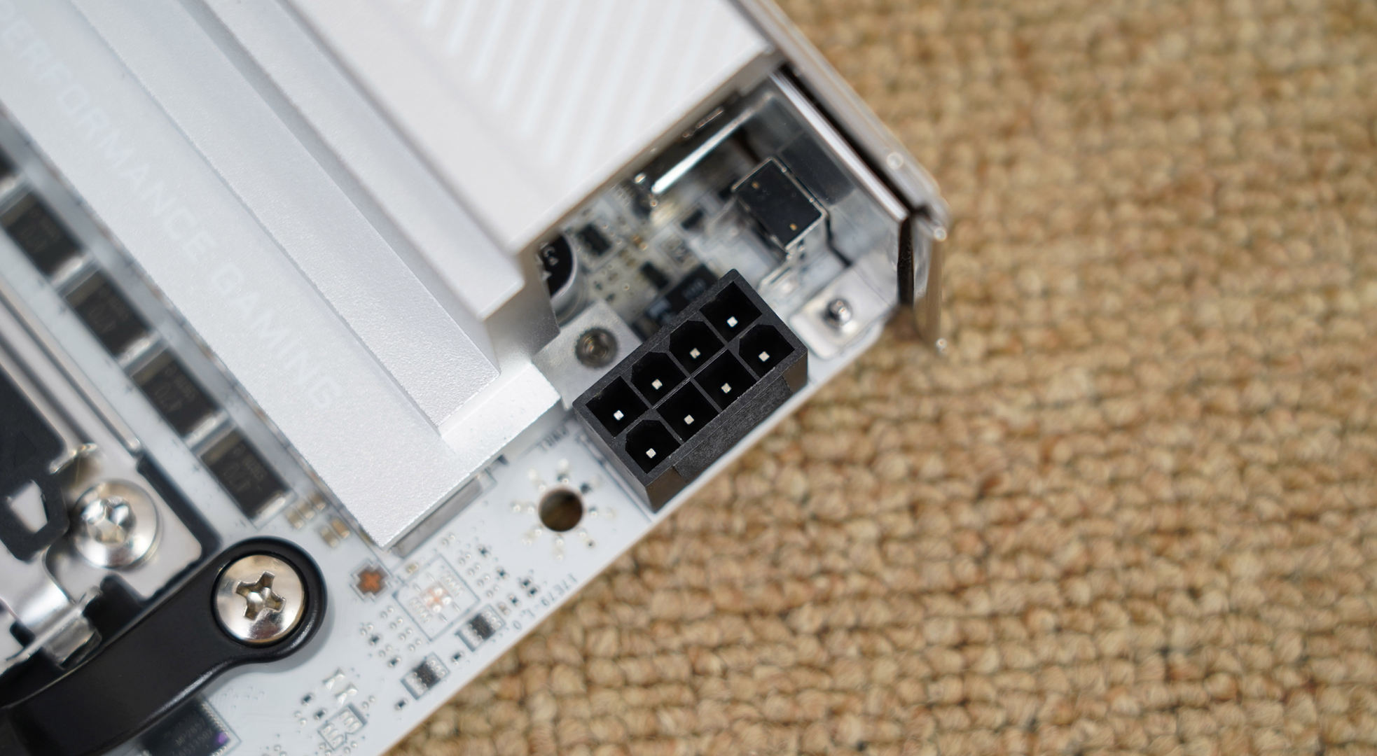 主板标配了一条PCIe 5.0 ×16钢铁装甲设计的显卡插槽,在其上方,还提供了1个配备了冰霜铠甲散热器的PCIe 5.0 ×4 M.2接口。