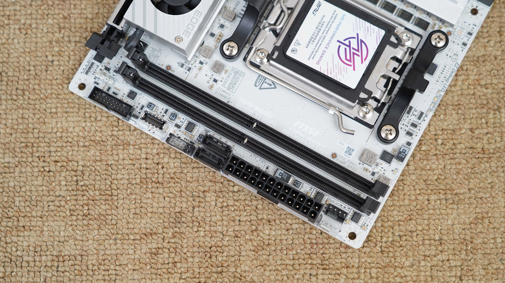 主板采用了白色一体式I/O挡板,接口较为丰富,除了提供常规的HDMI、USB 5Gbps、USB 10Gbps及音频接口外,还提供了BIOS清除按键、BIOS升级按键、USB 20Gbps Type-C接口、5G网口及WIFI7天线,扩展性非常强。