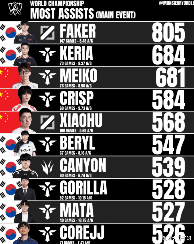 在第四、第五位,榜单上迎来了两位中国选手的身影——刘青松(Crisp)与小虎(Xiaohu),Crisp在60场比赛中交出584次助攻,场均9.73次,几乎与顶级辅助持平,他曾帮助FPX登顶世界冠军,如今依然是LPL赛区的顶尖辅助,而小虎则是唯一入榜的中单,出战100场,累计568助攻,场均5.68次,值得一提的是,小虎是榜单中位置转换最多的选手之一——从中单到上单再到中单,依然能保持高助攻效率,足以见其多面与团队意识。