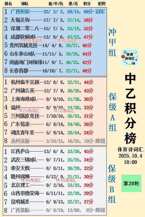 2025赛季中国足球三级联赛,中超将在11月22号结束,中甲在11月8号闭幕,而中乙则在本月26号就将落下帷幕。今天,中乙倒数第三轮,也就是第28轮展开多场对决,两个保级组的多支球队都迎来了关键对决,取胜则柳暗花明,落败则跌入深渊,其中泉州亚新不胜则降级,另外争冠组也有一场大战。