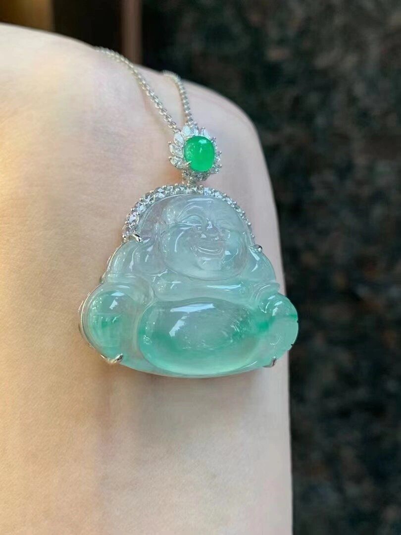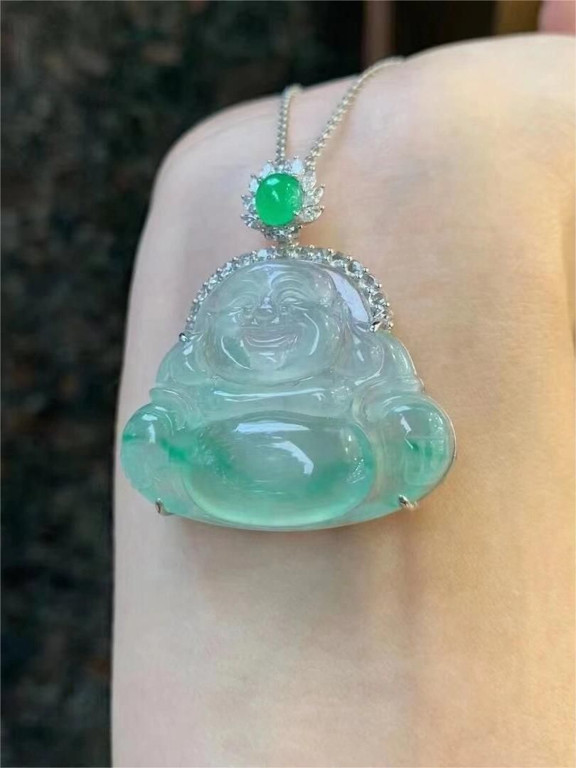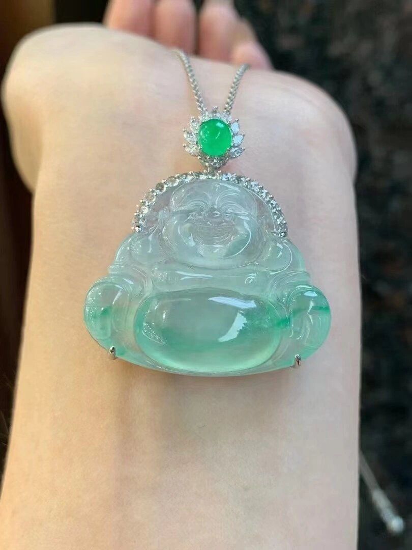 这枚佛公吊坠以木那玻璃种飘绿的翡翠打造,呈现出干净淳美的独特魅力。