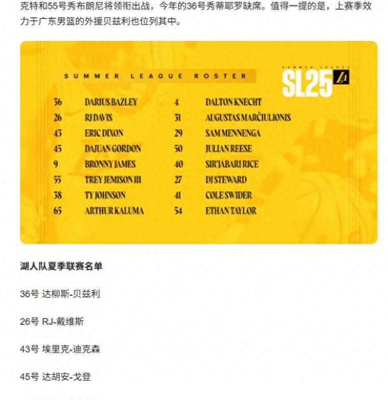 传来了广东男篮的消息,贝兹利入选湖人夏联大名单