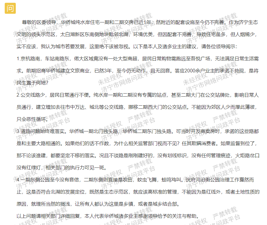 近日,济宁名城事小编从相关渠道获悉,有网友在济宁市网络问政平台反映济宁华侨城纯水岸周边配套设施不完善问题。该网友称,纯水岸住宅一期和二期交房近1年,但配套缺失严重。太白湖新区东南侧地块虽环境优美,却因配套不足导致人烟稀少。对此,网友提出多项建议: