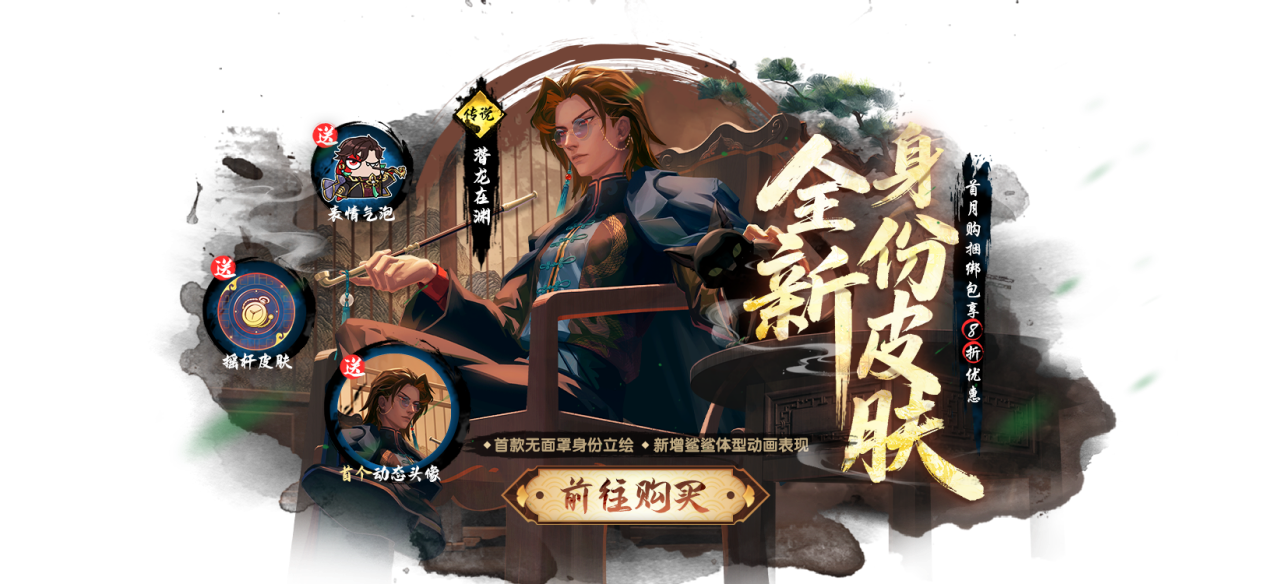 首款教父皮肤「潜龙在渊」上线,作为内鬼阵营的重要身份,教父获得首款无面罩专属皮肤,设计融入了东方龙元素,技能特效全面升级,可前往游戏限时购买,首月购捆绑包享8折优惠!