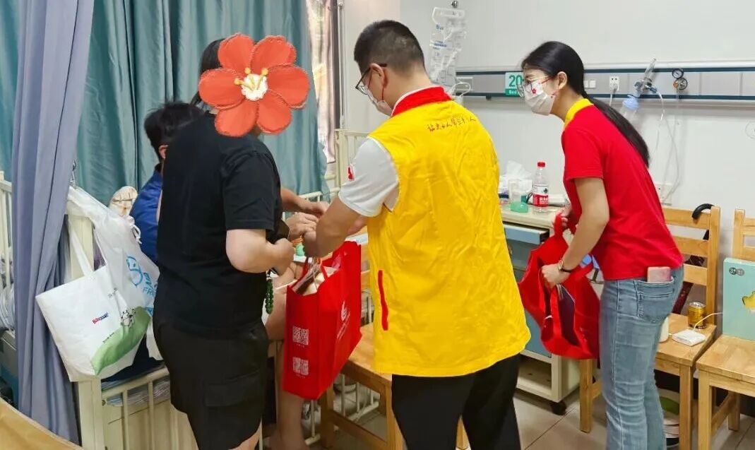病房探访时,志愿者们给孩子们送上的20份爱心包(月饼、油画棒套装、绘本7册)成了节日里最温暖的风景。