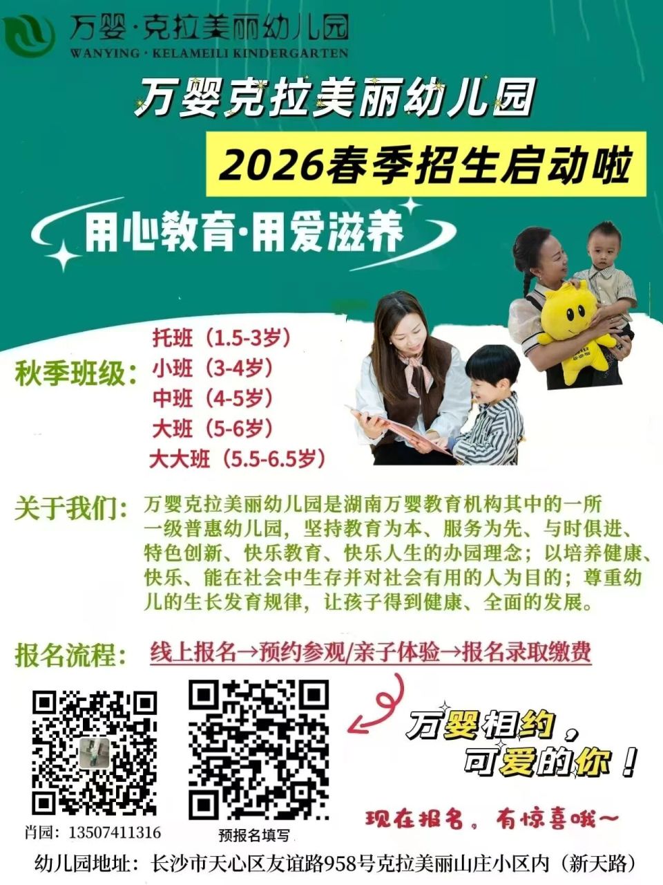 万婴克拉美丽幼儿园是湖南万婴教育机构其中的一所一级普惠幼儿园。万婴教育机构坚持教育为本、服务为先、与时俱进、特色创新、快乐教育、快乐人生的办园理念;以培养健康、快乐、能在社会中生存并对社会有用的人为目的;以蒙台梭利中国化的教学特色,尊重婴幼儿的生长发育规律,让孩子得到健康、全面的发展。