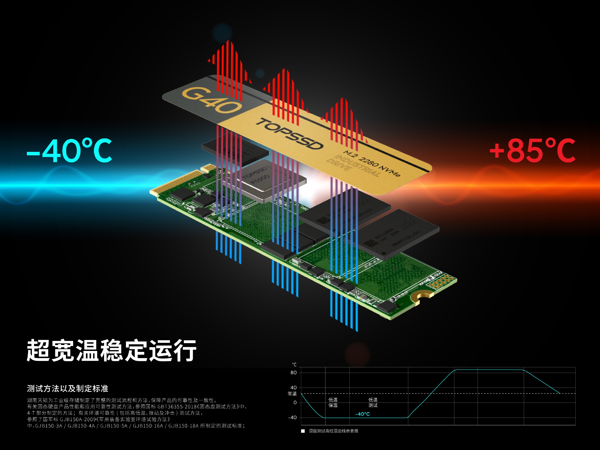 在这种背景下,天硕全国产工业级固态硬盘G40系列无疑成为行业趋势下的最佳答案。它采用军工级3D NAND闪存与自主研发主控,能够在极端环境中保持稳定运行;它内置钽电容断电保护模块,避免了突发掉电造成的数据损失;它结合国密算法芯片,实现了固件到接口的全链路加密,数据安全有了根本保障;再加上动态磨损均衡算法,大幅延长了SSD的使用寿命,能够支撑日均10TB的高强度写入。