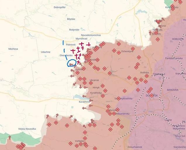 在波克罗夫斯克附近,俄罗斯想要绕过雷区包围城市,但并未取得明显进展。虽然他们在增加了兵力,但补给不足限制了他们进一步推进的能力。